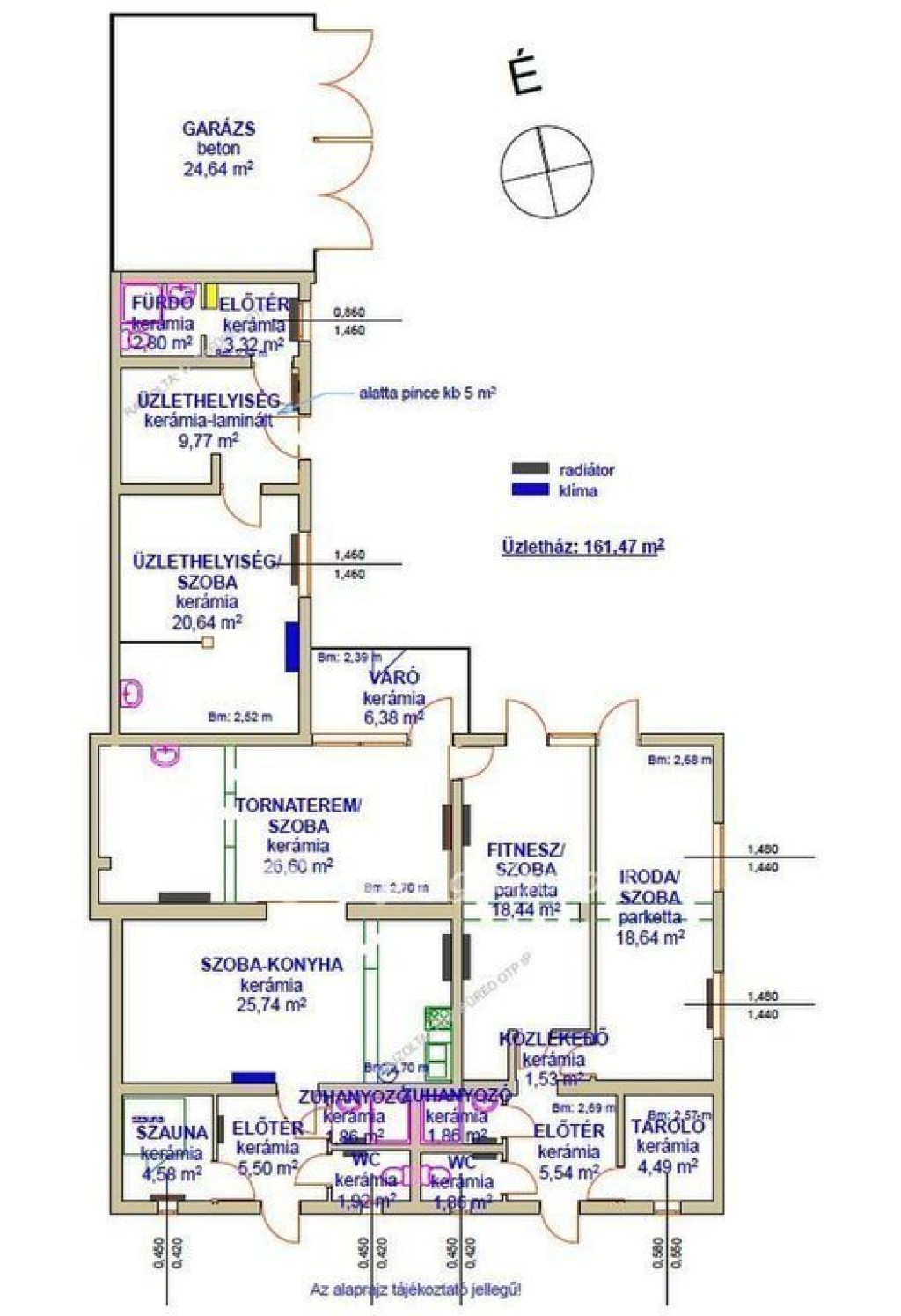 Helyiségek: a képek között található alaprajz szerint két lakrész van, elől egy régebbi 123,48 m2 (lakóház), hátul önálló bejárattal még további két egység egy épületben: 161,47 m2 (üzletház).