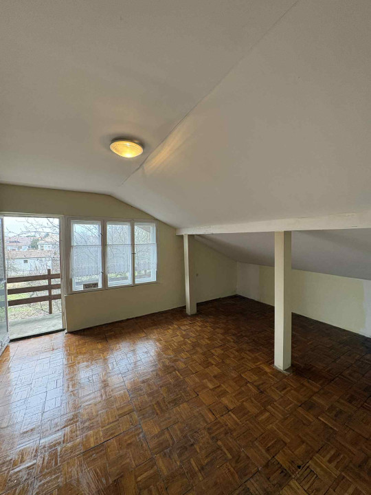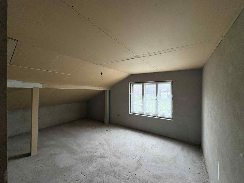 A tetőtérben egy szoba és fürdőszoba félig beépített állapotban van.