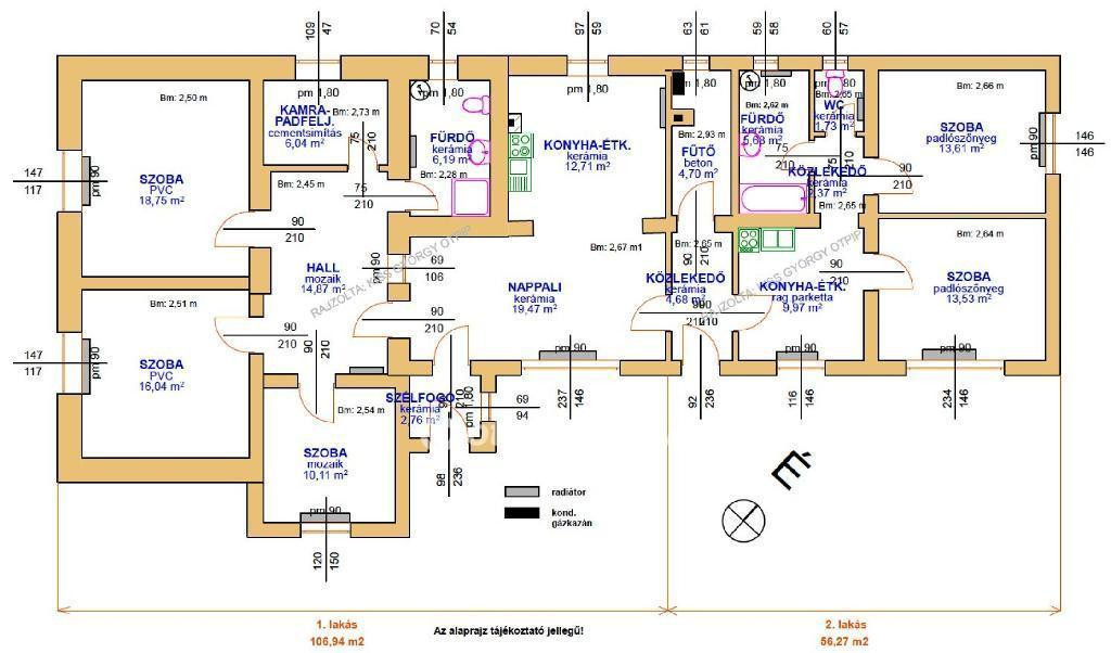 Helyiségek: 1. épületrész: 2 szoba, 1 félszoba, nappali-étkező, kamra, hall, fürdőszoba, konyha, szélfogó, összesen: 106,94 m2; 2. épületrész: 2 szoba, WC, fürdőszoba, konyha, közlekedő, fűtőhelyiség, összesen: 56,27 m2.