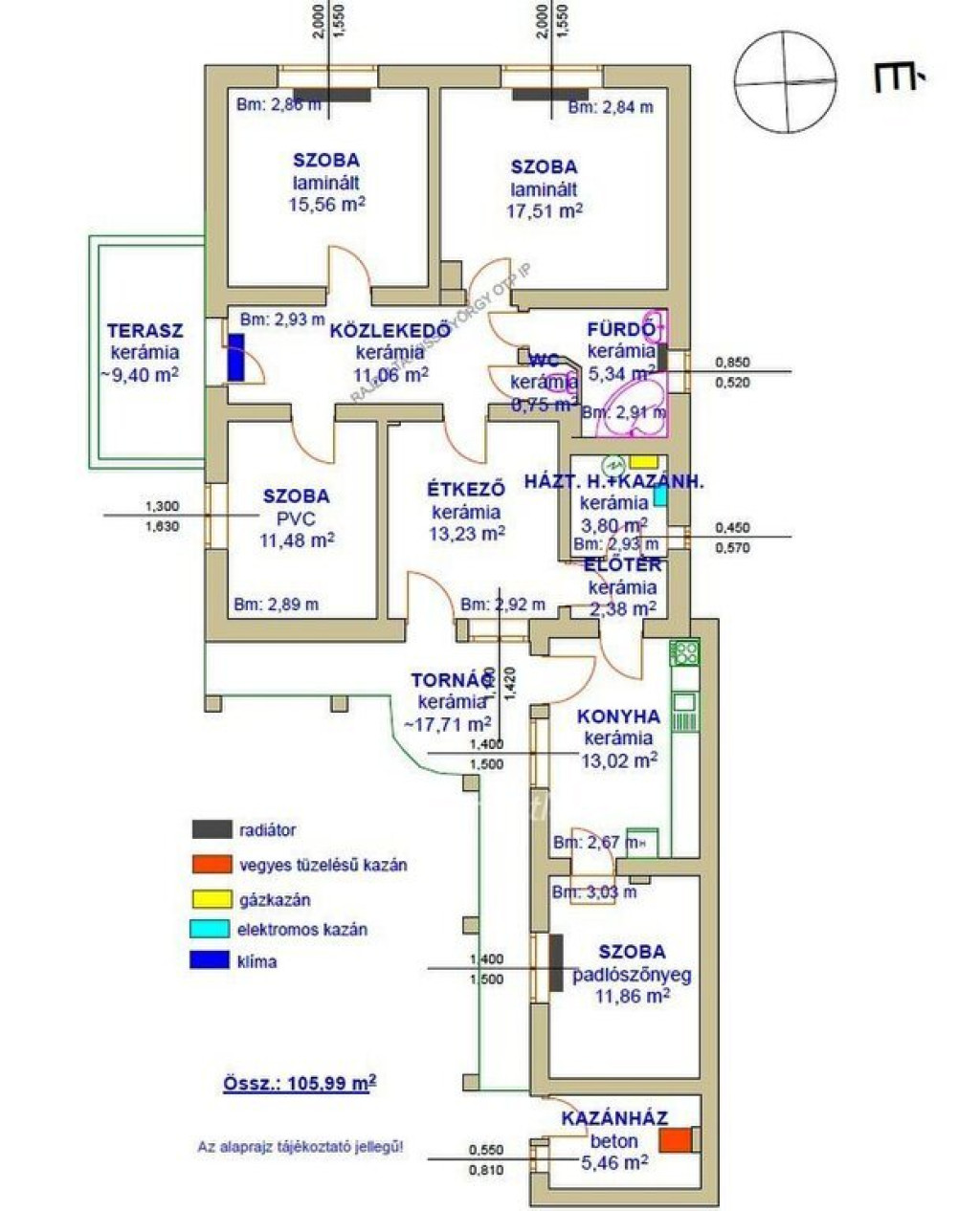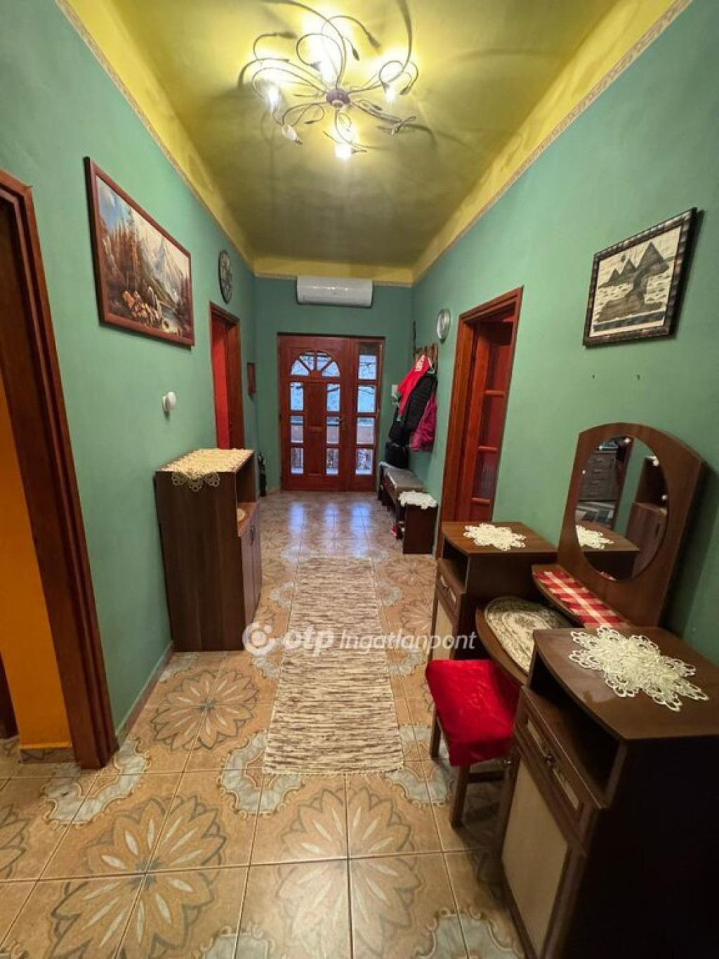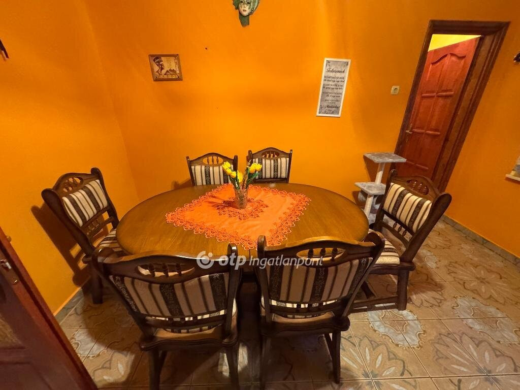 Helyiségek: 4 szoba, konyha, étkező, fürdő, WC (külön), előtér, háztartási helyiség-fűtő, kazánház, közlekedő, terasz, tornác, melléképület (garázs).