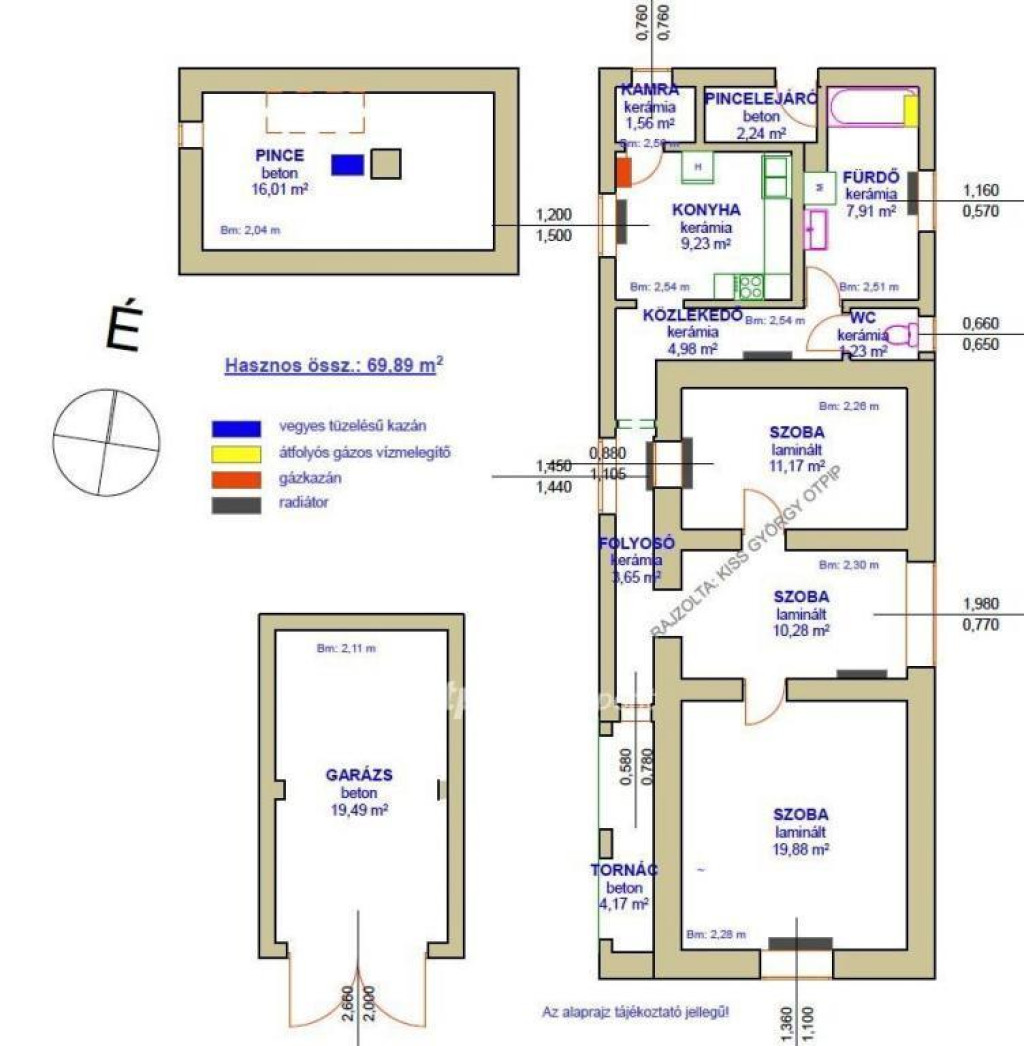 Helyiségek: szoba, félszoba, konyha, fürdő, WC (külön), közlekedők, kamra, pincelejáró, pince, különálló garázs, melléképület.