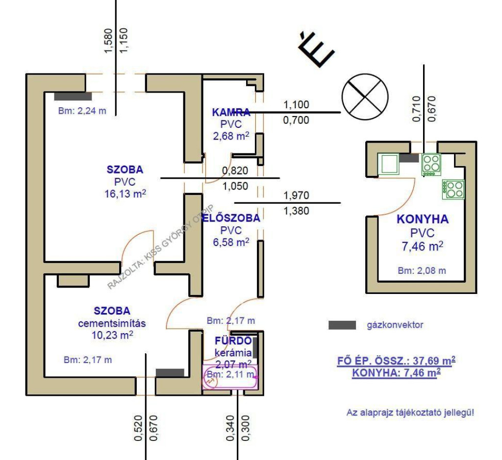 Helyiségek: 2 szoba, előszoba, fürdő, kamra, külön épületben konyha (WC udvarban).