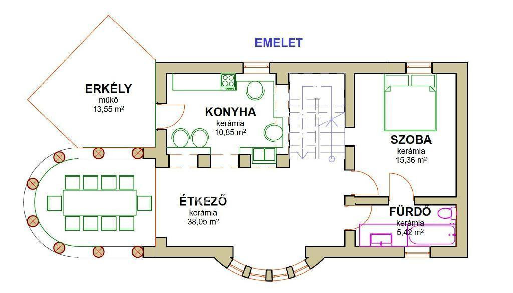 Emelet: szoba, konyha, étkező, fürdő, erkély, összesen: 69,68 m2, plusz 13,55 m erkély.