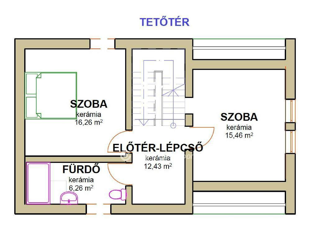 Tetőtér: 2 szoba, előtér-lépcső, fürdő, összesen: 50,41 m2.