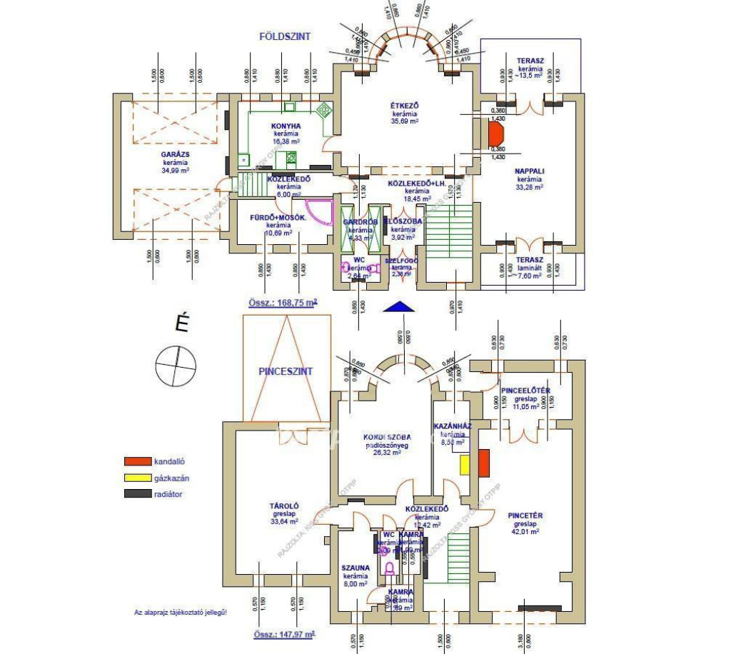 Fűtés: kombi gázkazán radiátorokkal, részben padlófűtéssel, 2 db épített kandallóval.