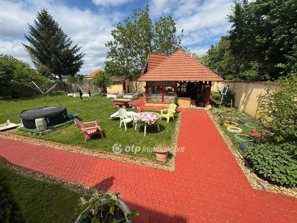 Az ingatlan udvara rendezett, parkosított, körbekerített, jelentős része térkővel burkolt, rajta kerti csap, fúrt kút, különálló fedett kerti pavilon, gyümölcsfák (cseresznye, sárgabarack, birs, datolyaszilva).