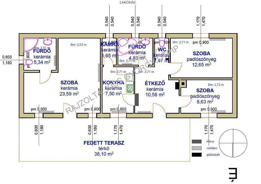 Fűtés: 32 kW-os új gázkazán radiátorokkal, klíma (3 db).