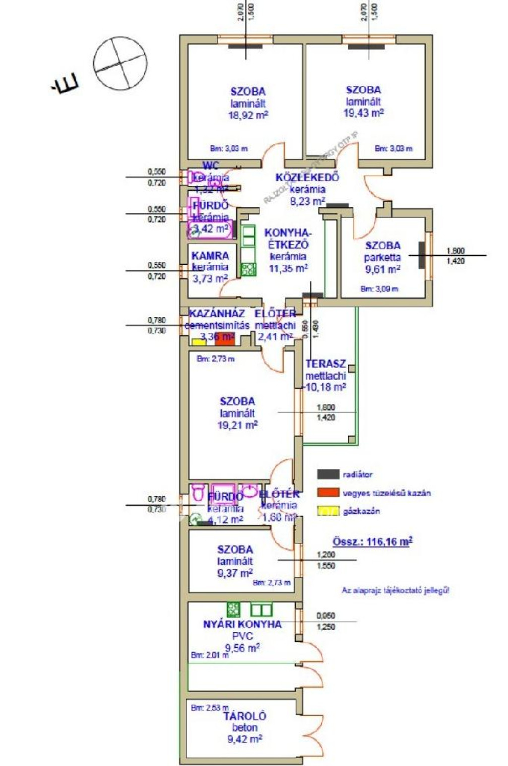 Helyiségek: 3 szoba, 2 félszoba, konyha-étkező, WC, fürdő (külön), előtér, fürdő (WC-vel), közlekedő, kamra, kazánház, nyári konyha, tároló, 2 előtér.