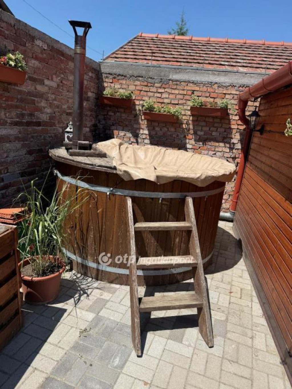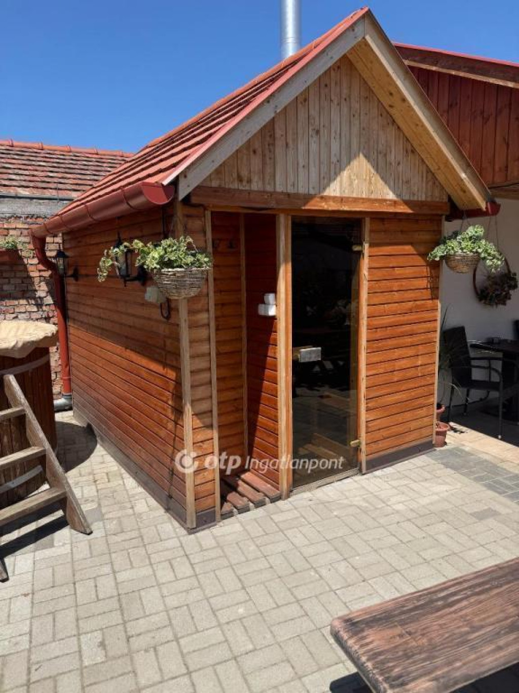 Az ingatlan udvara rendezett, parkosított, körbekerített (elől lemez kerítés, elektromos kapunyitós kapu), jelentős része térkővel burkolt, rajta fúrt kút, bográcsozó, kerti bútor, lemezgarázs, dézsafürdő, finn szauna.