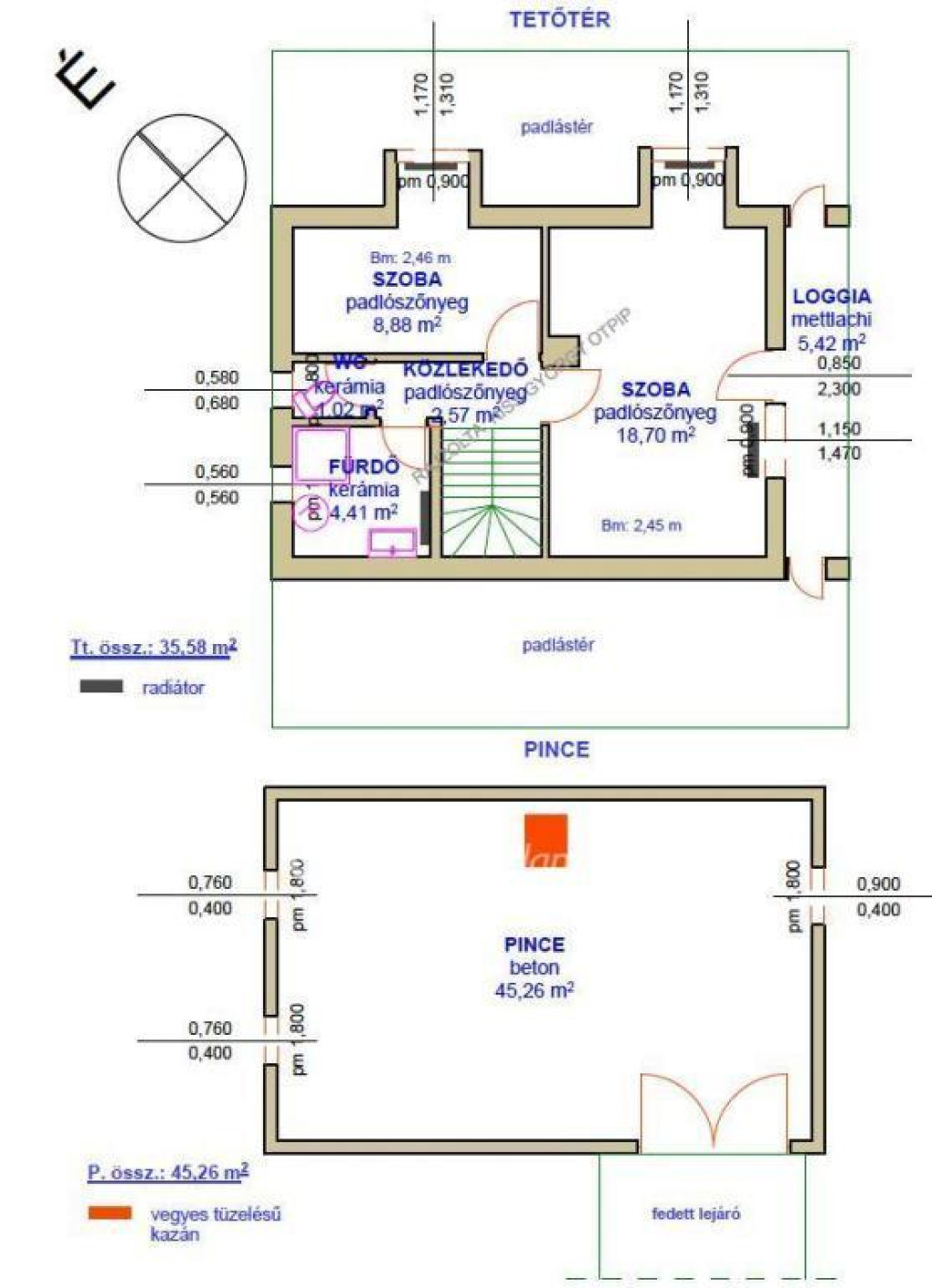 Helyiségek: pince (45,26 m2); földszint: 2 szoba, konyha, étkező, kamra, előszoba-közlekedő, fürdő, WC (külön) (77,25 m2); tetőtér: szoba, félszoba, közlekedő, fürdő, WC (külön) (35,58 m2), loggia.