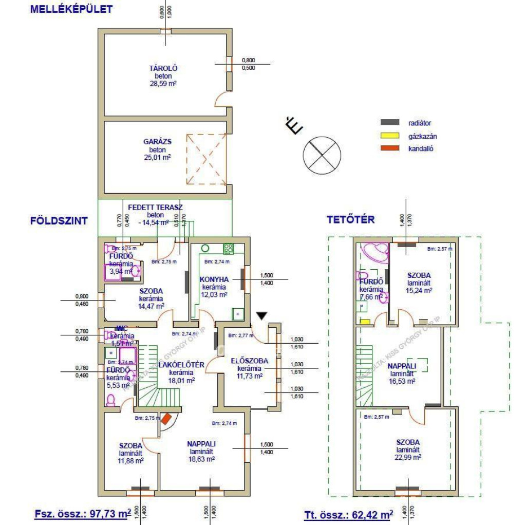 Fűtés: kombi gázkazán radiátorokkal, nappaliban kandalló is.