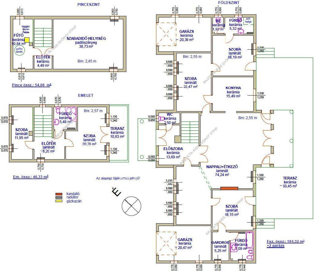 Helyiségek: földszint: előszoba, 3 szoba, nappali-étkező, 2 fürdő (egyik WC-vel, bidével, másik bidével), 2 külön WC, konyha, gardrób, terasz, 2 garázs; emelet: 2 szoba, fürdő (WC-vel), előtér, terasz; pince: szabadidő helyiség, előtér-háztartási helyiség, kazánház. A ház a két garázzsal együtt 325,57 m2!!!