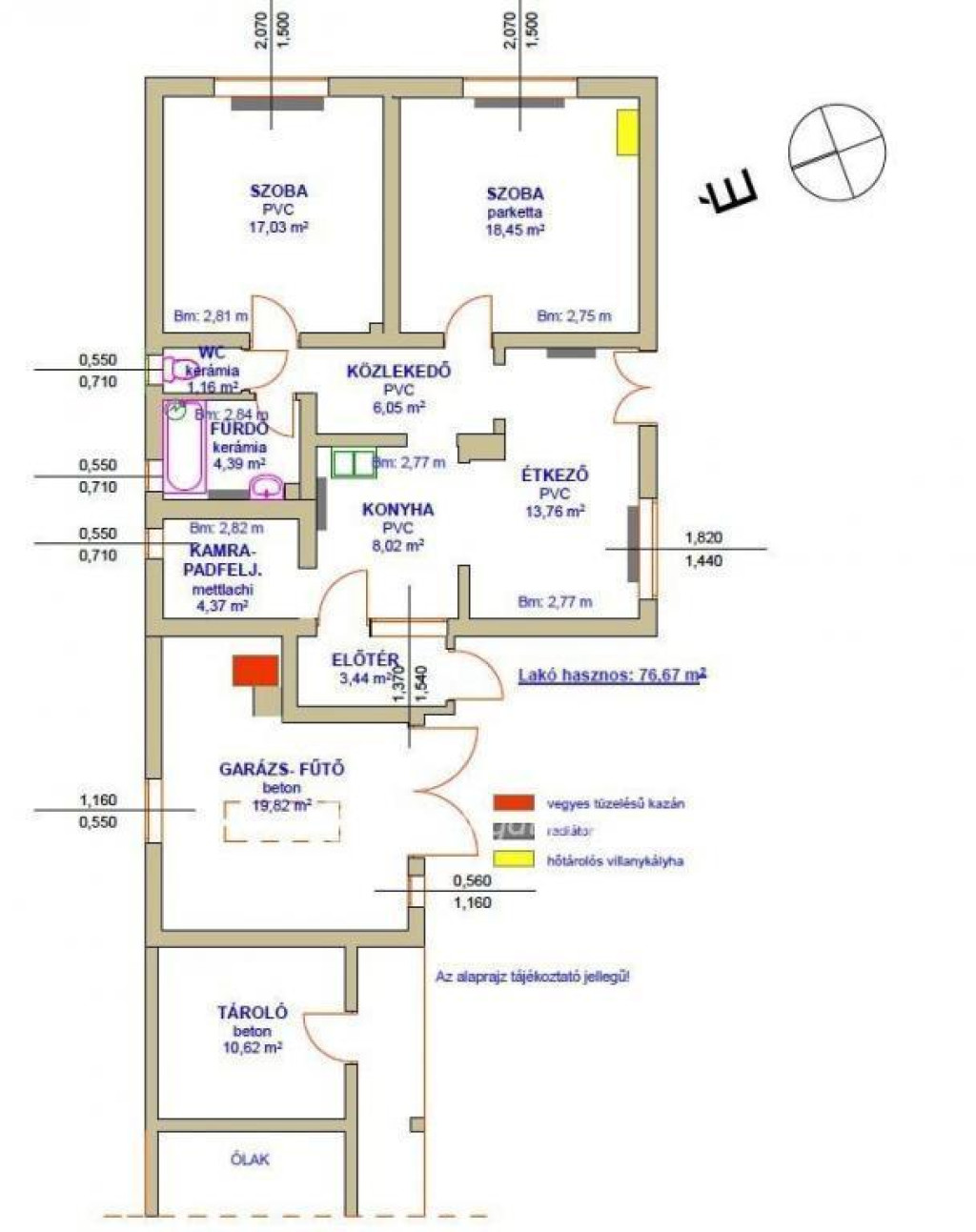 Fűtés: vegyes tüzelésű kazán radiátorokkal, 1 hőtárolós villanykályha.