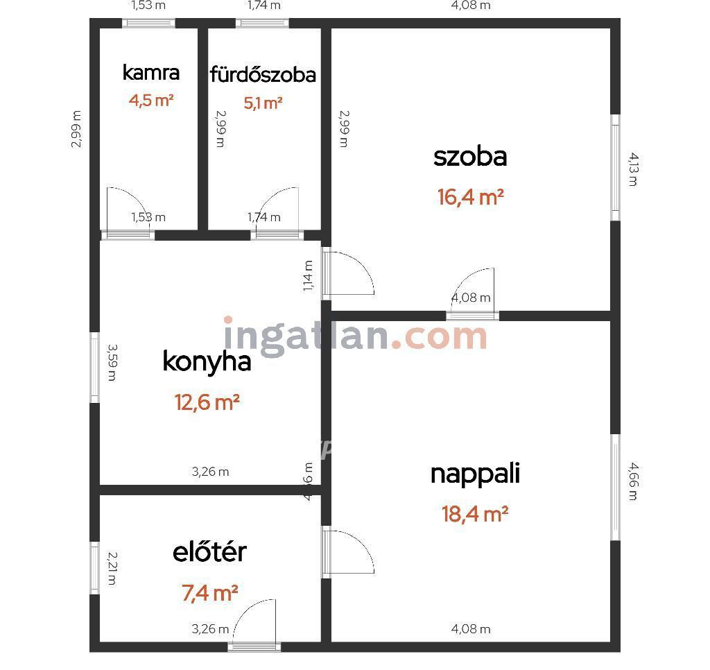 Helyiségek: nappali, szoba, konyha, fürdőszoba, kamra