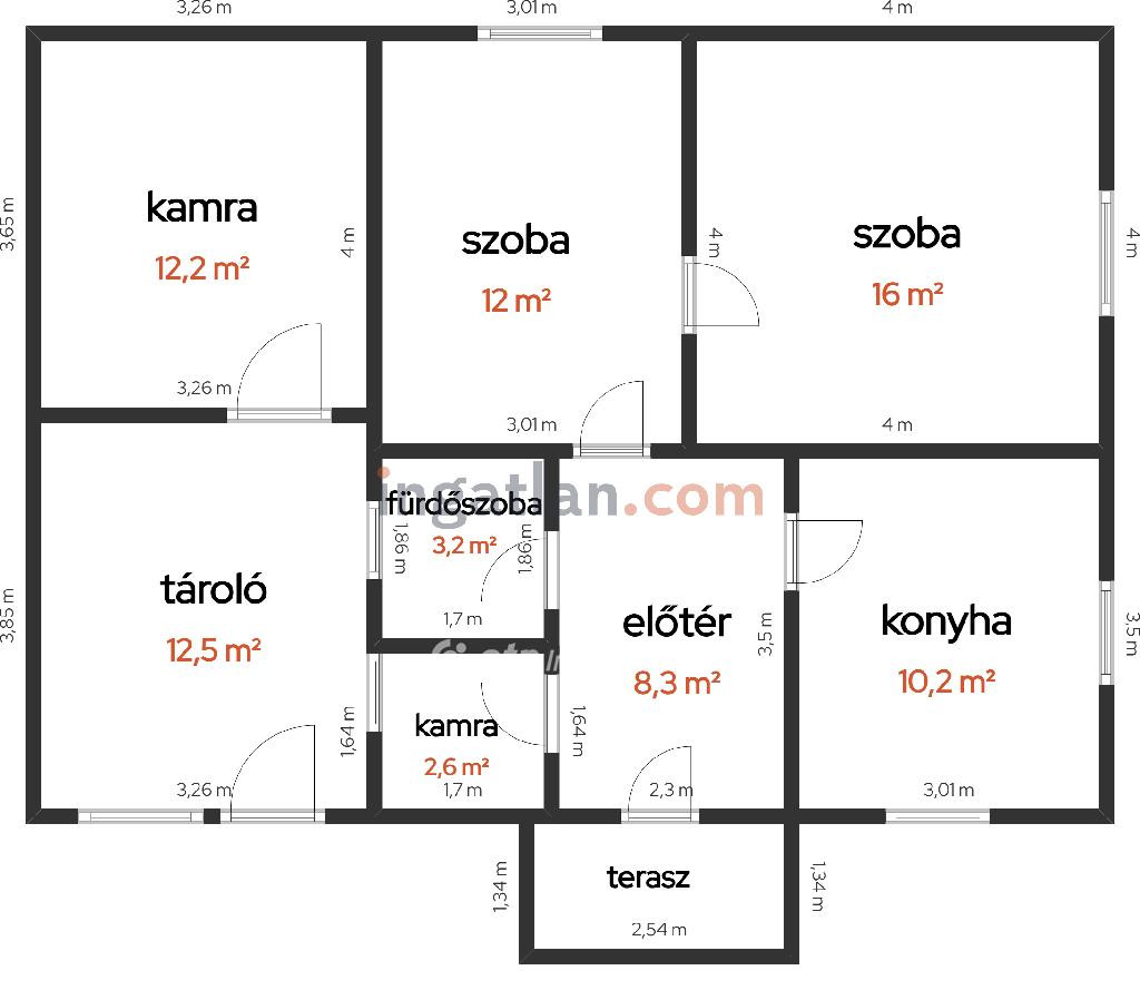 A telek területe 766 nm, 52 nm hasznos alapterületű lakóházzal, 25 nm-es kamrával ami akár tovább is bővíthető.