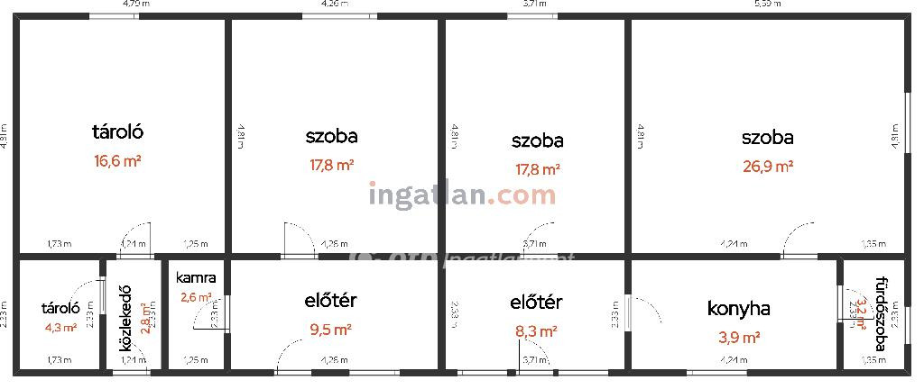 A 418 nm-es telken álló ingatlan 95 nm hasznos alapterületű, tégla alapon, vályog falazattal épült, 3 tágas szobával, konyhával, fürdőszobával és előszobával.