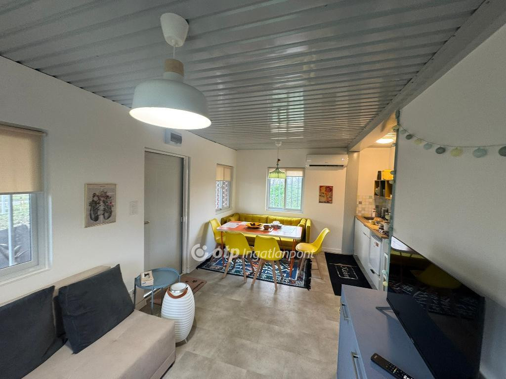 Helyiségek: 1 félszoba, 1 nappali (konyhával, étkezővel), fürdő (WC-vel egyben), tároló, fedett terasz.