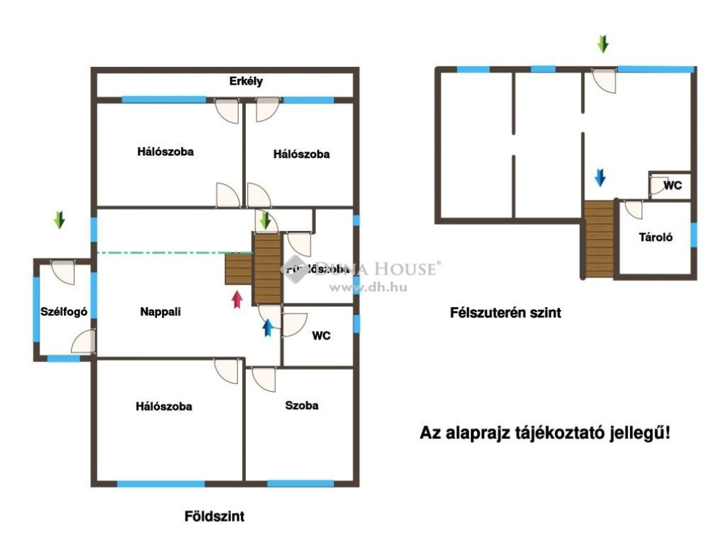 A tágas nappali (27,61 m²) mellé három külön nyíló, normál méretű hálószoba társul, melyből kettő nagy méretű erkéllyel rendelkezik. Az extra belmagasságú tetőtér beépíthető, így akár további lakóteret is kialakíthat új tulajdonosa. A félszuterén szint(44 m²) berendezett, saját mosdóval ellátott. A 3 szint megközelítése a lakótérből biztosított. A földszinti konyha jelenleg szobaként funkcionál, de minden kiállással előkészítve várja visszaalakítását.