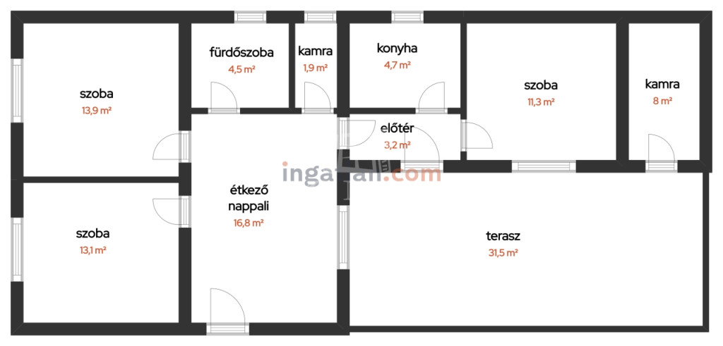 A családi ház az alábbi helyiségekből áll: nappali/étkező 16,8 nm, szoba 13,1 nm, szoba 13,9 nm, szoba 11,3 nm, konyha 4,7 nm, fürdőszoba 4,5 nm, kamra 1,9 nm, előtér 3,2 nm, kamra 8 nm, fedett terasz 31,5 nm.