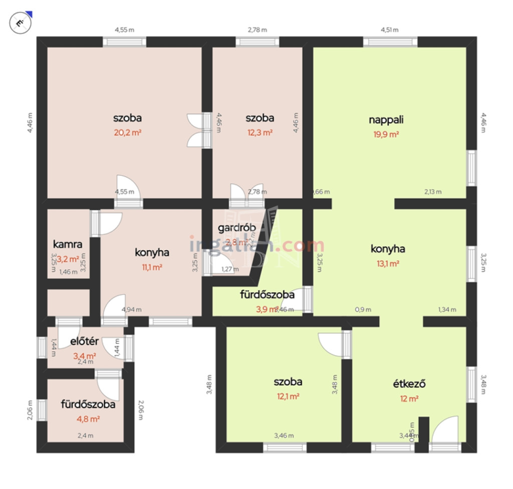 nappali 19,9m2, konyha 13,1m2, fürdőszoba-wc 3,9m2, szoba 12,1m2, előtér 12m2;