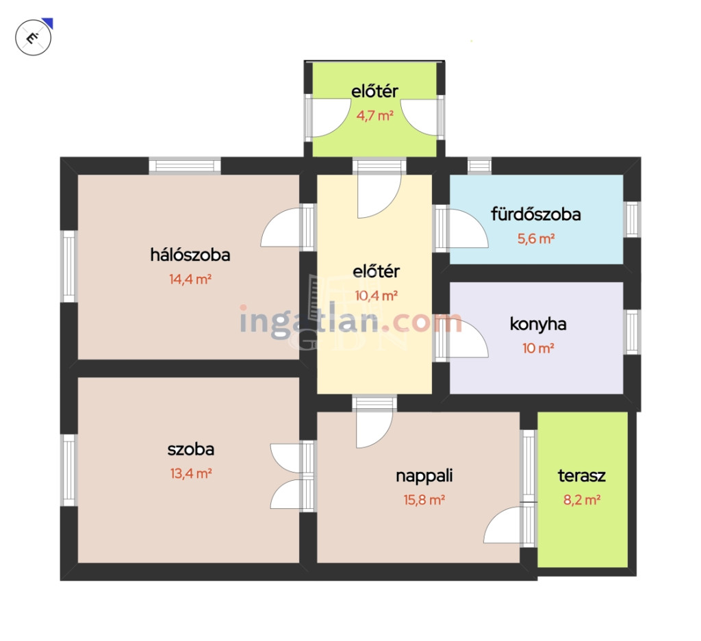 nappali 15,80m2, szoba 13,41m2, szoba 14,40m2, konyha 10m2, fürdőszoba 5,61m2, közlekedő-előtér 10,37m2, téli kert 4,7m2, 3,83m2, fedett terasz 8,19m2;