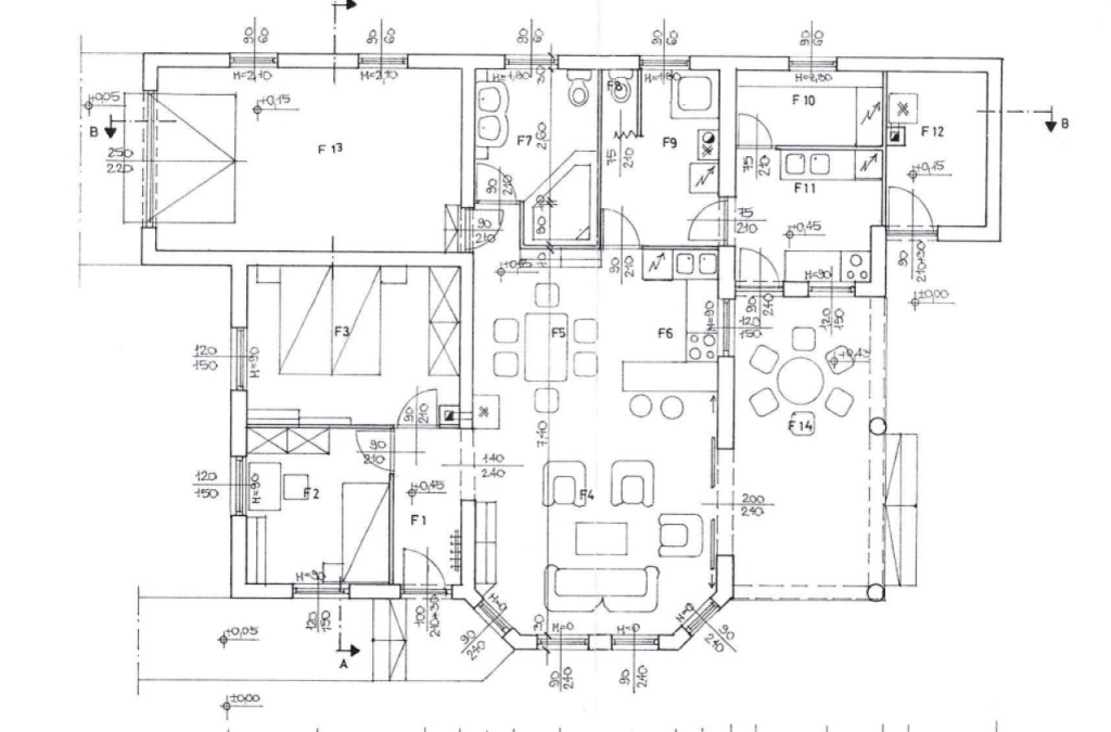 Az otthon helyiségei: előtér 4,20 m2, gardrób 9,00 m2, hálószoba 12,60 m2, nappali 23,00 m2, étkező 14,15 m2, konyha 11,80 m2, kamra 3,00 m2, közlekedő 1,44 m2, fürdőszoba 6,24 m2, Háztartási helyiség 5,98 m2 garázs 21,60 m2, nyári konyha 6,00 m2, kazánház 10,00 m2, tároló 10,52 m2, fedett terasz 18,60 m2