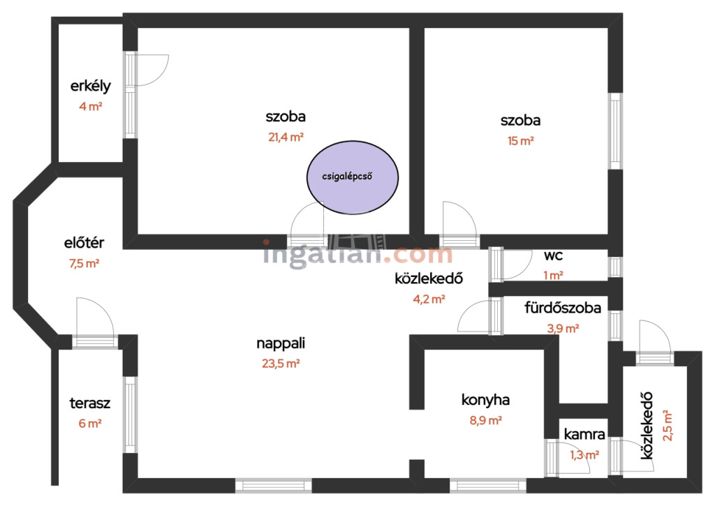 földszint: nappali 23,5m2, előtér 7,5m2, szoba 21,4m2, szoba 14,98m2, közlekedő 4,23m2, konyha 8,8m2, fürdőszoba 3,88m2, wc 1m2, kamra 1,32m2, hátsó közlekedő 2,5 m2;