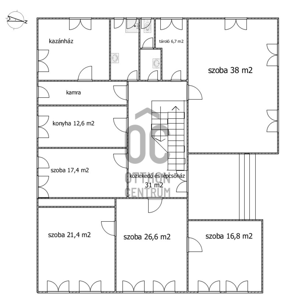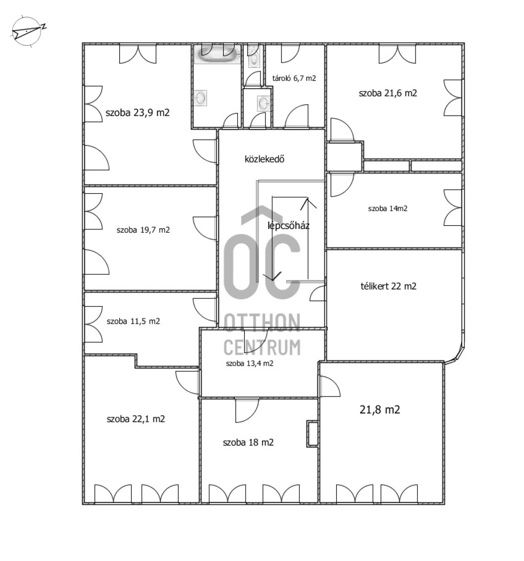 - Tágas közlekedő és lépcsőház, ahonnan a szobák nyílnak,