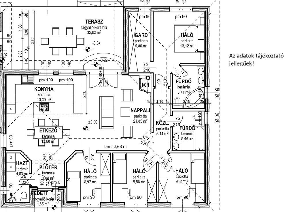 Az elrendezés átgondolt és praktikus: amerikai konyhás nappali, négy hálószoba, két fürdőszoba, gardrób és háztartási helyiség áll rendelkezésre. A 33 nm-es fedett terasz közvetlen kapcsolattal bővíti a nappali életterét.