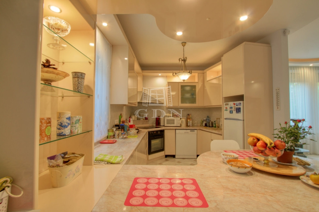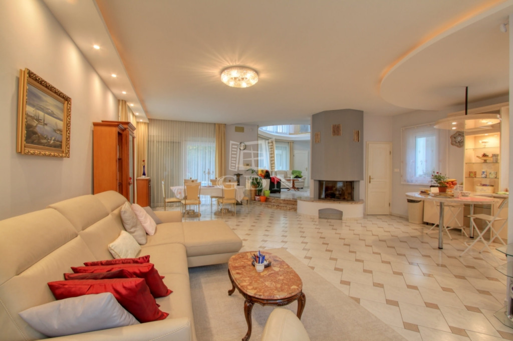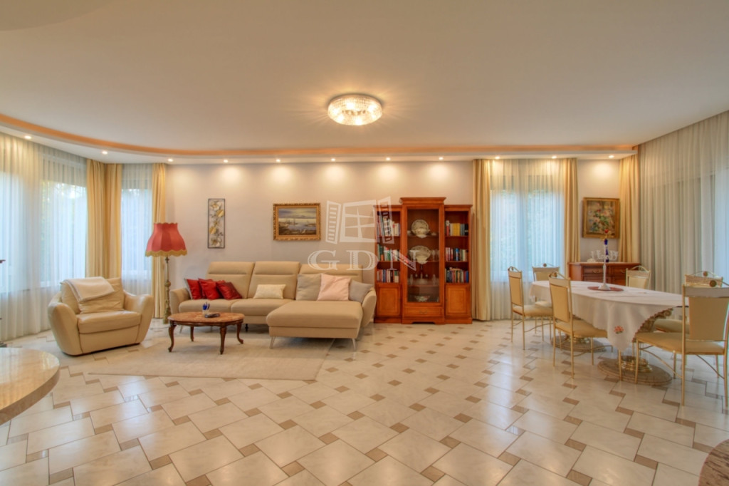 A földszinti lakótérbe lépve az előszobából nyílik a ház tágas és világos központi társalgó vagy étkező helyisége, kilátással a kertre, teraszra és medence térre. Bal oldalon található a hangulatos kandallóval rendelkező, 50 m2-es nappali és 7 m2-es konyha egy légtérben. Jobb oldali irányban találjuk az emeletre vezető lépcsőt, mosókonyhát, illetve egy ajtón keresztül átjuthatunk a külön bejárattal is rendelkező lakásba. Az előszobából nyílik egy vendég WC, a konyhához 2,4 m2-es kamra helyiség kapcsolódik.