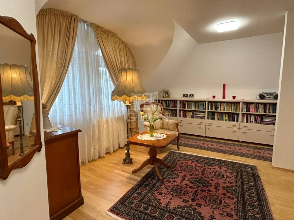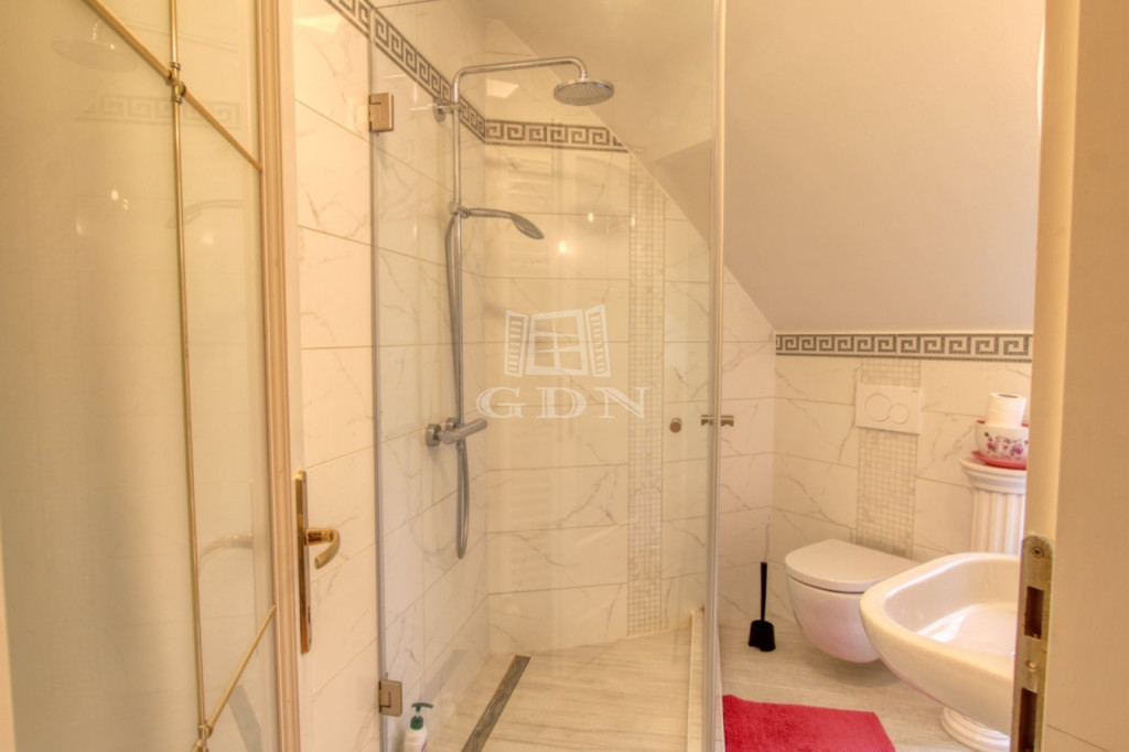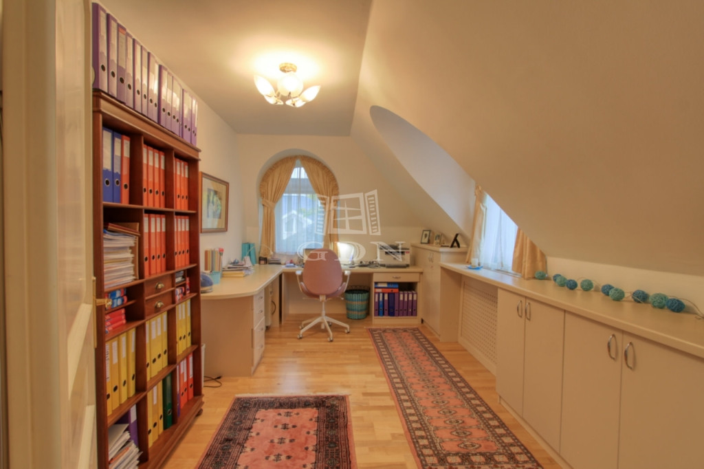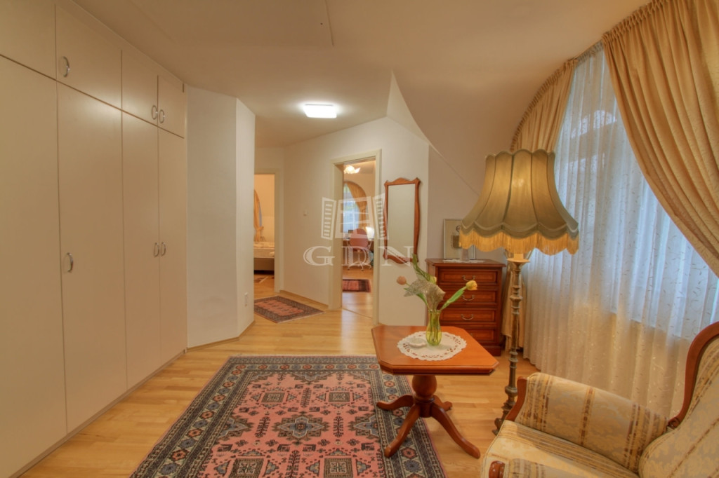 Az emeleti szinten a kör alakú galéria térből juthatunk egy 15 m2-es gardrób szobán keresztül 2 db hálószoba felé (ahol az egyik hálószobához erkély kapcsolat és zuhanyzós fürdőszoba tartozik), illetve a fő hálószoba és dolgozószoba irányába. A fő hálószobából tágas, walk-in zuhanyzóval, pezsgőfürdős káddal rendelkező fürdőszoba nyílik.