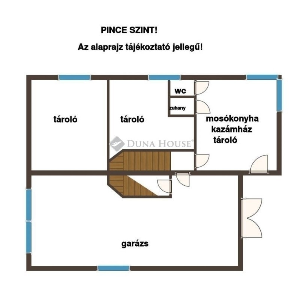 -Pinceszint: 4 autós garázs (2 nagy + 2 közepes/kis autó kényelmesen), két tároló, ~23 m²-es kazánház/mosókonyha zuhanyzóval és külön WC-vel. Plusz két többcélú helyiség (korábban konditerem és raktár).