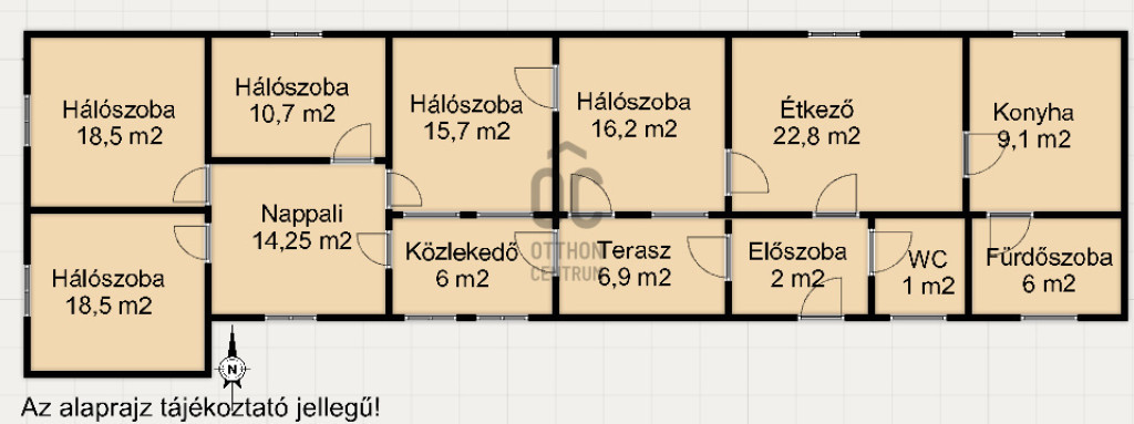 - a földszintes lakóépület terei tágasak, nagyon jó elosztásúak, 5 hálószoba, nappali, konyha + étkező, előszoba, fürdő, WC, terasz helyiségekből áll
