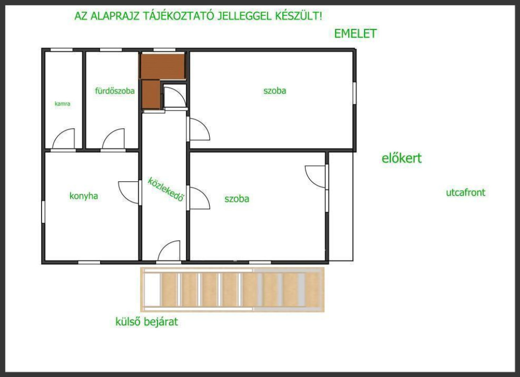Az emeleten, előtér 1 nagyobb +1 kisebb szoba erkély, zuhanyzó WC -vel, kialakítható, gardrob helyiséggel.