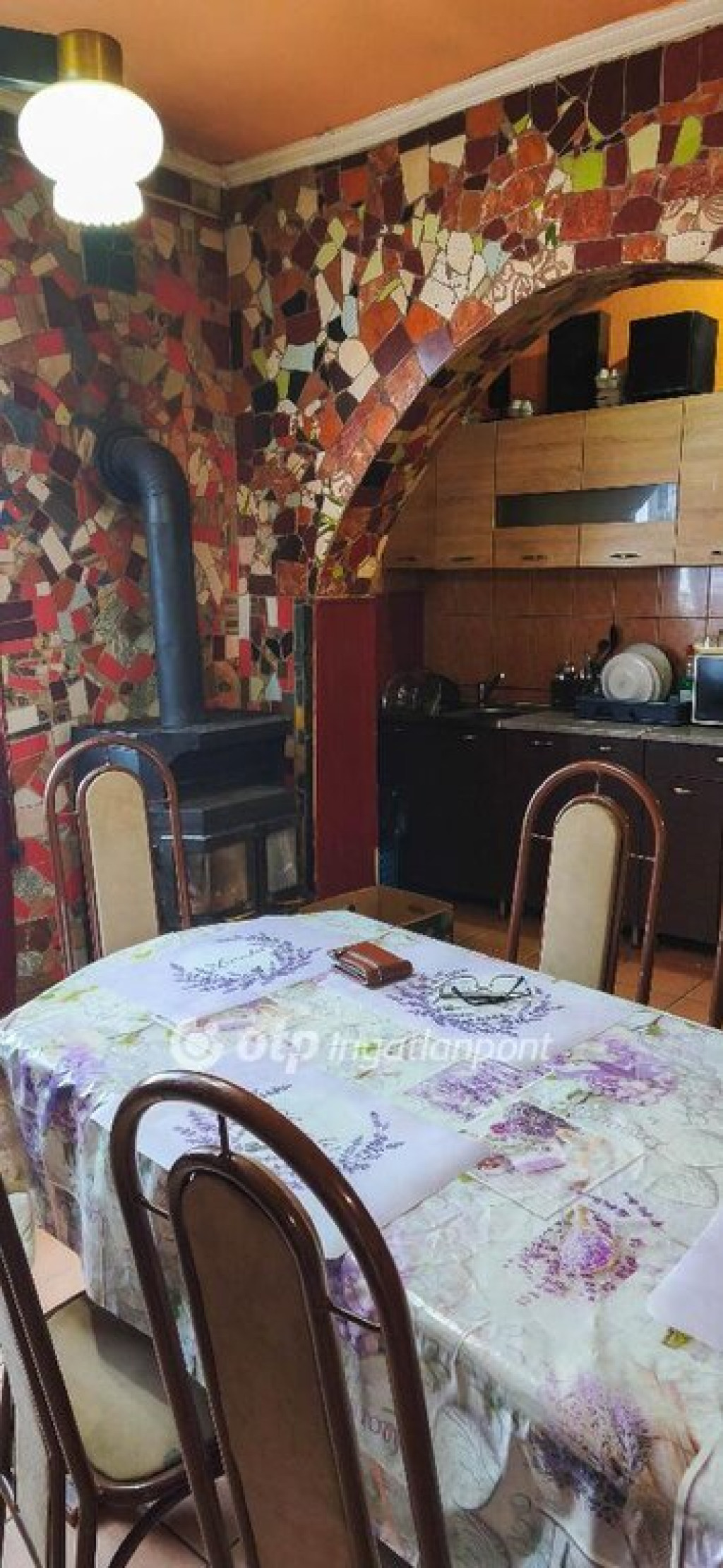 A fűtésről cserépkályha gondoskodik, valamint a nappaliban bekötésre került egy hűtő-fűtő klíma is.