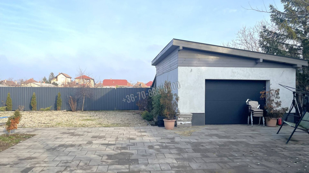 A tágas, világos télikert ideális helyszíne lehet egy reggeli kávénak vagy egy nyugodt délutáni pihenésnek. A kert öntözése fúrt kútról megoldható, és az udvarban épült egy 30 m²-es garázs, melyet Hörmann elektromos garázskapuval szereltek fel.