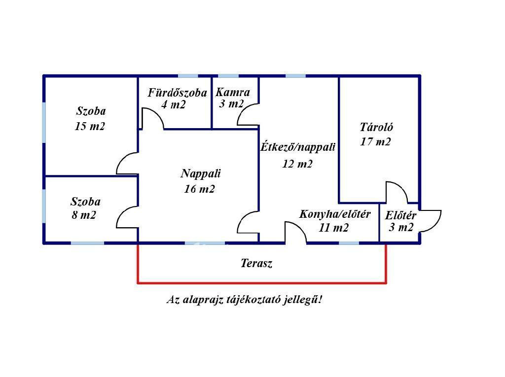 - Helyiségek: szoba, nappali, étkező/nappali, előtér/konyha, fürdőszoba/WC, előtér, tároló (szobává alakítható)