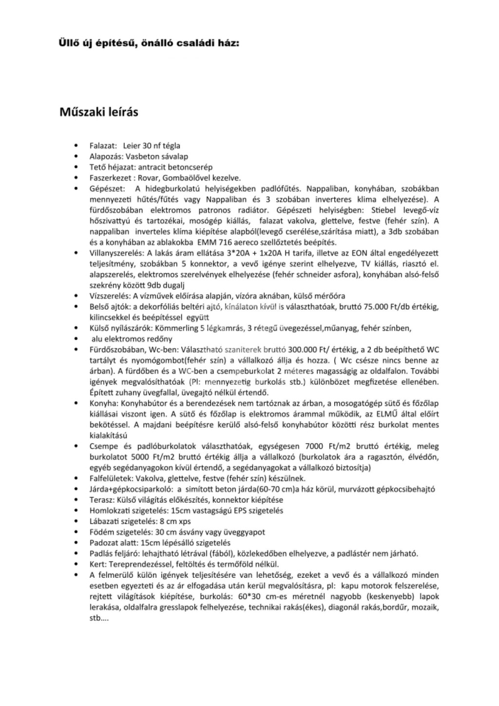 Csempe és padlóburkolatok választhatóak, egységesen 7000 Ft/m2 bruttó értékig, meleg burkolatot 5000 Ft/m2 bruttó értékig állja a vállalkozó (burkolatok ára a ragasztón, élvédőn, egyéb segédanyagokon kívül értendő, a segédanyagokat a vállalkozó biztosítja)