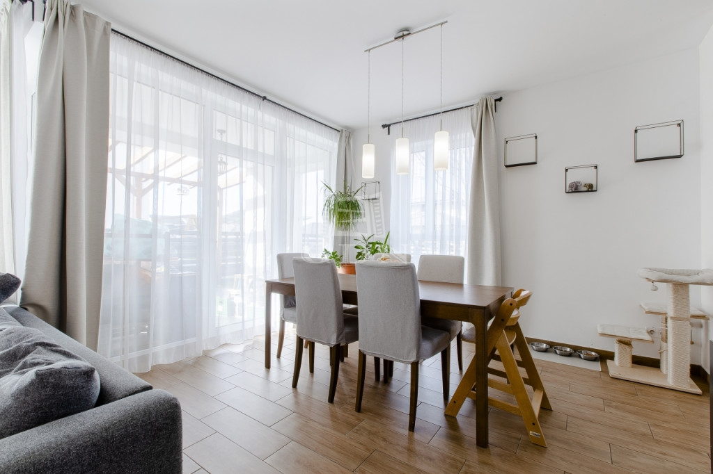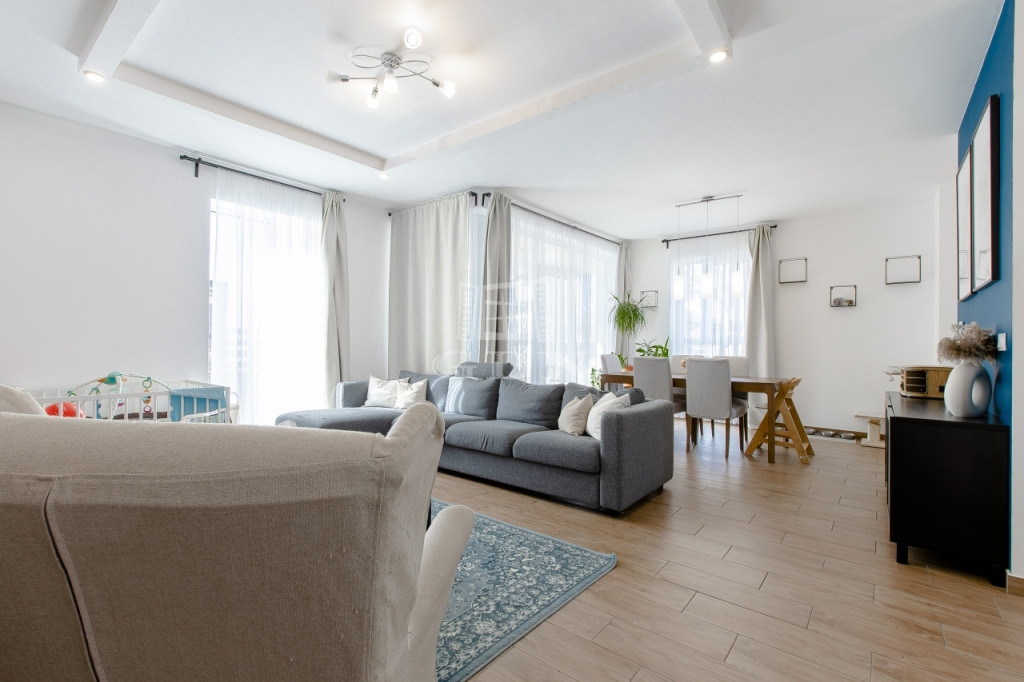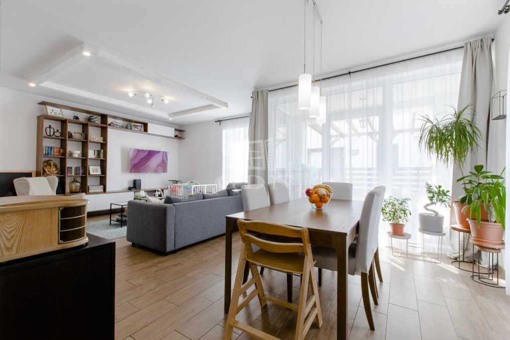 A földszinten található egy gépészeti helyiség, wc kézmosóval, kényelmes nagy nappali konyhával, közvetlen kertkapcsolattal.