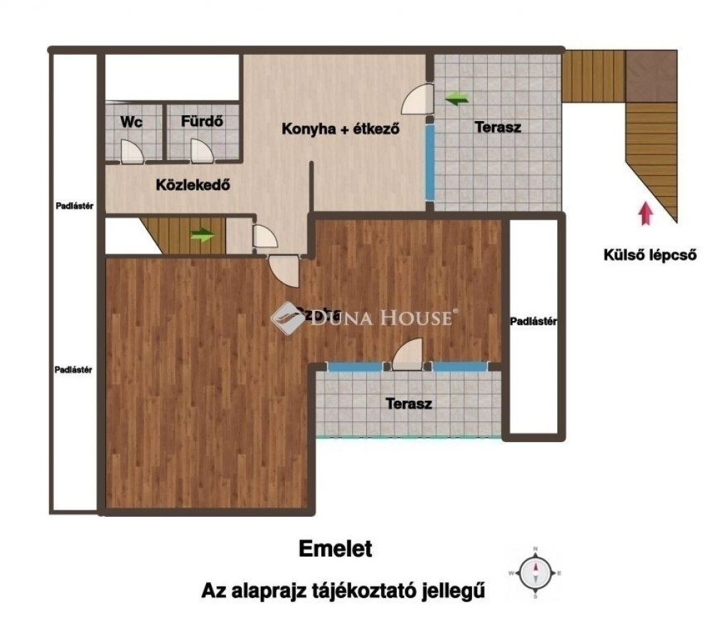 Nagy konyha: 13 m² (innen kijárat a 11 m²-es Fedett teraszra és az udvarra vezető külső lépcsősorhoz)