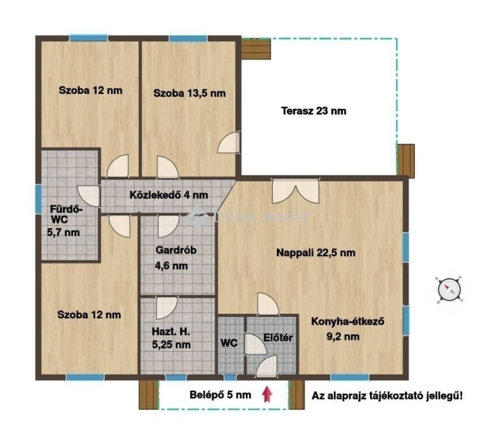 A lakás helyiségei: nappali (23 nm), 3 db szoba (13,5 nm, 12 nm és 12 nm) konyha-étkező (9,2 nm), háztartási helyiség (5,25 nm), közlekedő (4 nm), fürdő-wc (5,76 nm), gardrób (4,6 nm), WC (1,8 nm), előtér (3,6), fedett belépő (5 nm), terasz (23 nm).