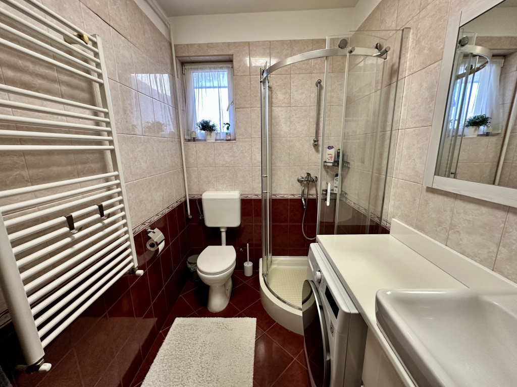 - Földszinti fürdőszoba: Zuhanykabinnal, WC-vel és mosógéppel felszerelt.