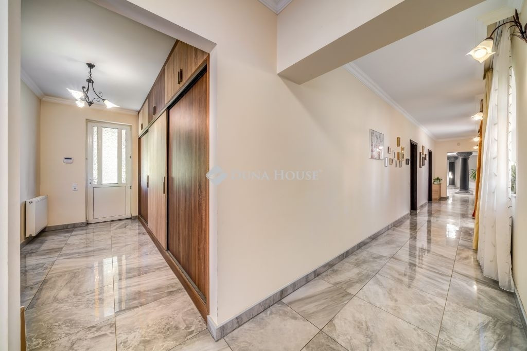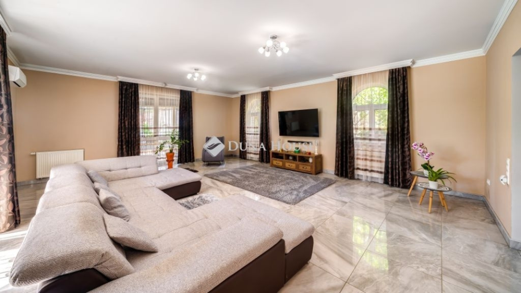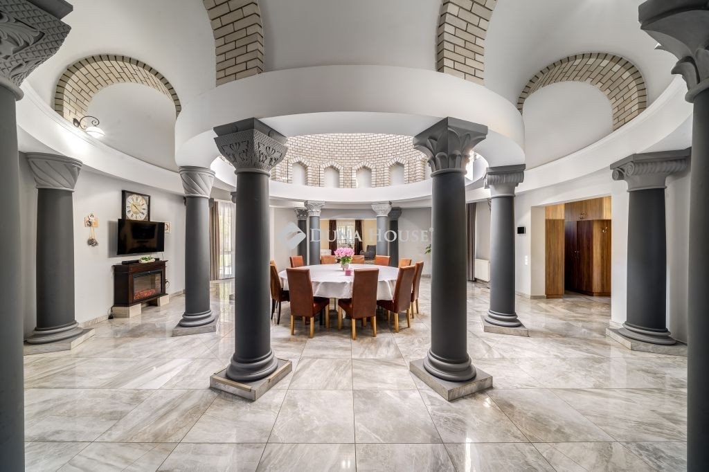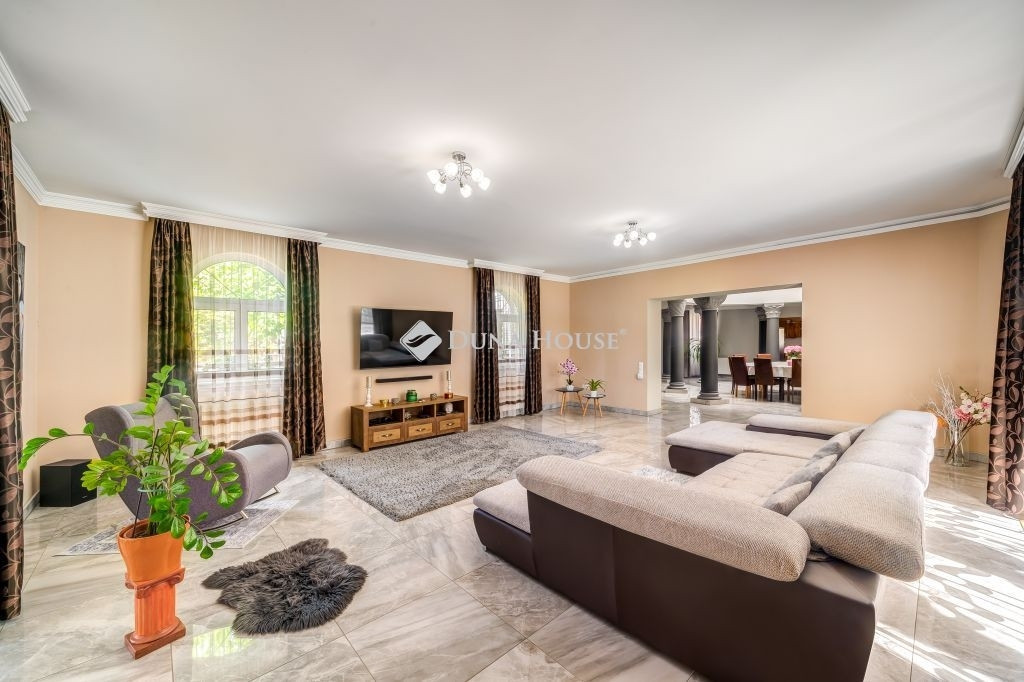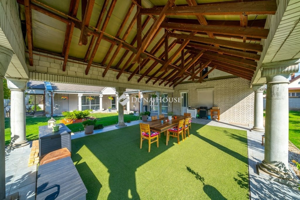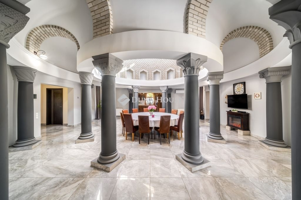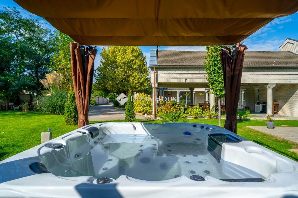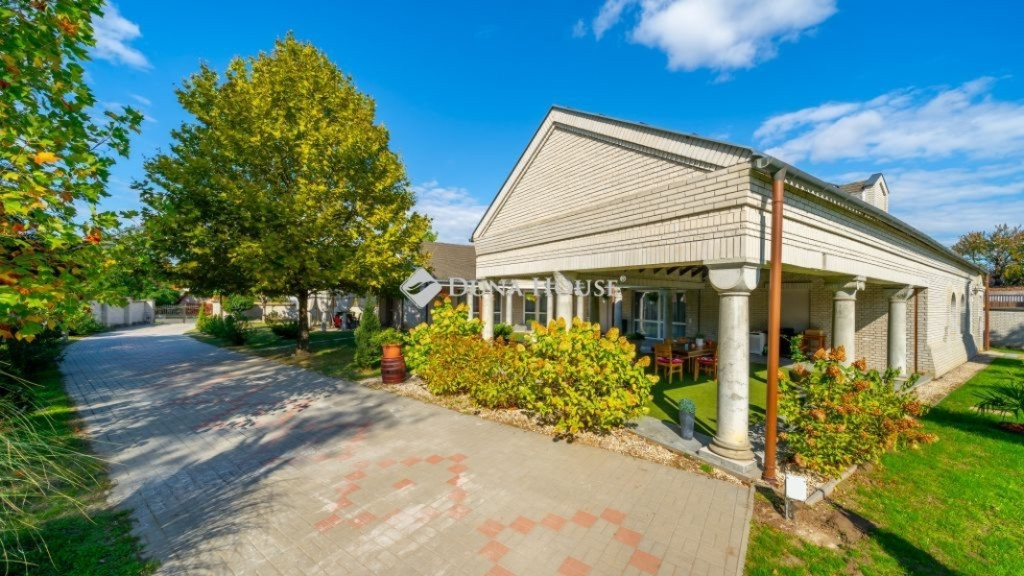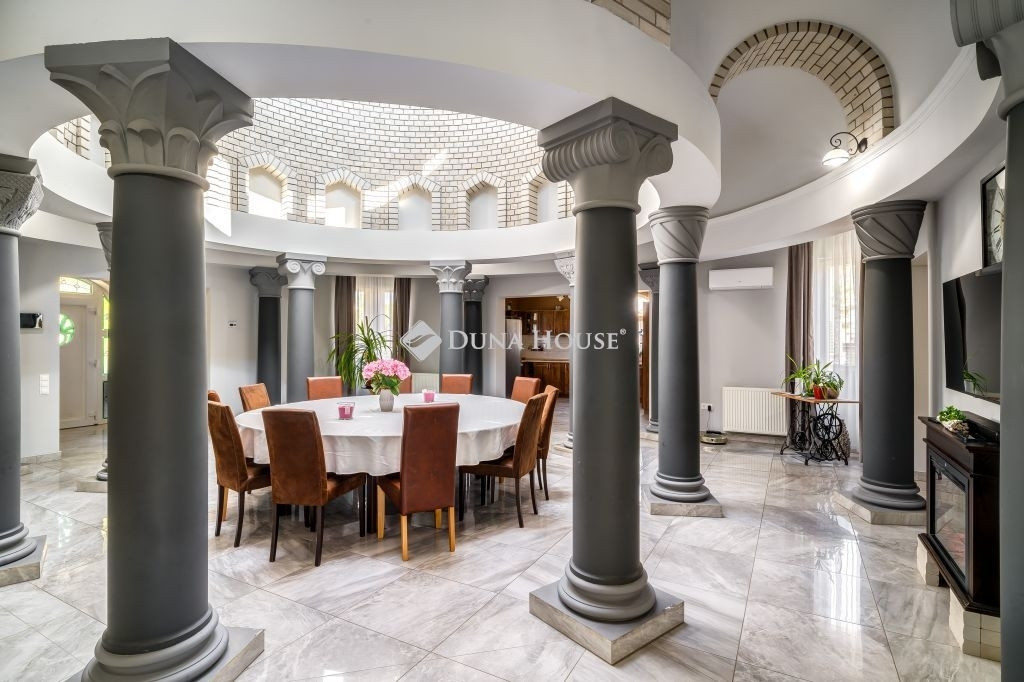 Tisztelt Érdeklődő!Engedje meg, hogy figyelmébe ajánljak egy igazán különleges ingatlant, amely egyszerre ötvözi a modern kényelmet és a klasszikus eleganciát.A közel 270 m²-es lakótér egy szinten helyezkedik el, tágas és jól átgondolt alaprajzzal. A központi étkezőterem impozáns oszlopsorral övezve különleges atmoszférát teremt, ideális családi összejövetelekhez és vendégek fogadásához. A nappali világos és tágas, a hálószobák kényelmes méretűek, a fürdőszobában jakuzzis fürdőkád található, emellett infraszauna és praktikus háztartási helyiség is szolgálja a mindennapokat.Az ingatlan közel 2 100 m²-es telken helyezkedik el, ahol fedett teraszok, napozóterasz és parkosított kert biztosítanak nyugodt pihenést. A medence elhelyezésére az előkészítés megtörtént.A ház korszerű gépészeti megoldásokkal felszerelt: napelemek, hőszivattyús fűtés, klíma és elektromos autó töltő gondoskodnak a fenntartható és gazdaságos működésről. Az épület energetikai besorolása A+, amely hosszú távon is előnyös választássá teszi.További értékek:- Különleges építészeti kialakítás oszlopsorral- Jakuzzis kád- 6 személyes kültéri infraszauna- kültéri jakuzzi- Kerti tároló- 2 nagy teljesítményű robotfűnyíró- Napelem és hőszivattyú (10 kW-os tárolóval, H-tarifával) Energiatakarékos gázcirkó- Elektromos autó töltő- Biztonsági rendszer: kamera, riasztó, biztonsági ajtóEz az ingatlan valóban különleges, tökéletes választás mindazok számára, akik tágas tereket, biztonságot és modern megoldásokat keresnek.Amennyiben felkeltette érdeklődését, szívesen állok rendelkezésére egy személyes bemutatás során.Üdvözlettel:Széll EmesePrémium Ügyfelek Privát Ingatlanosa