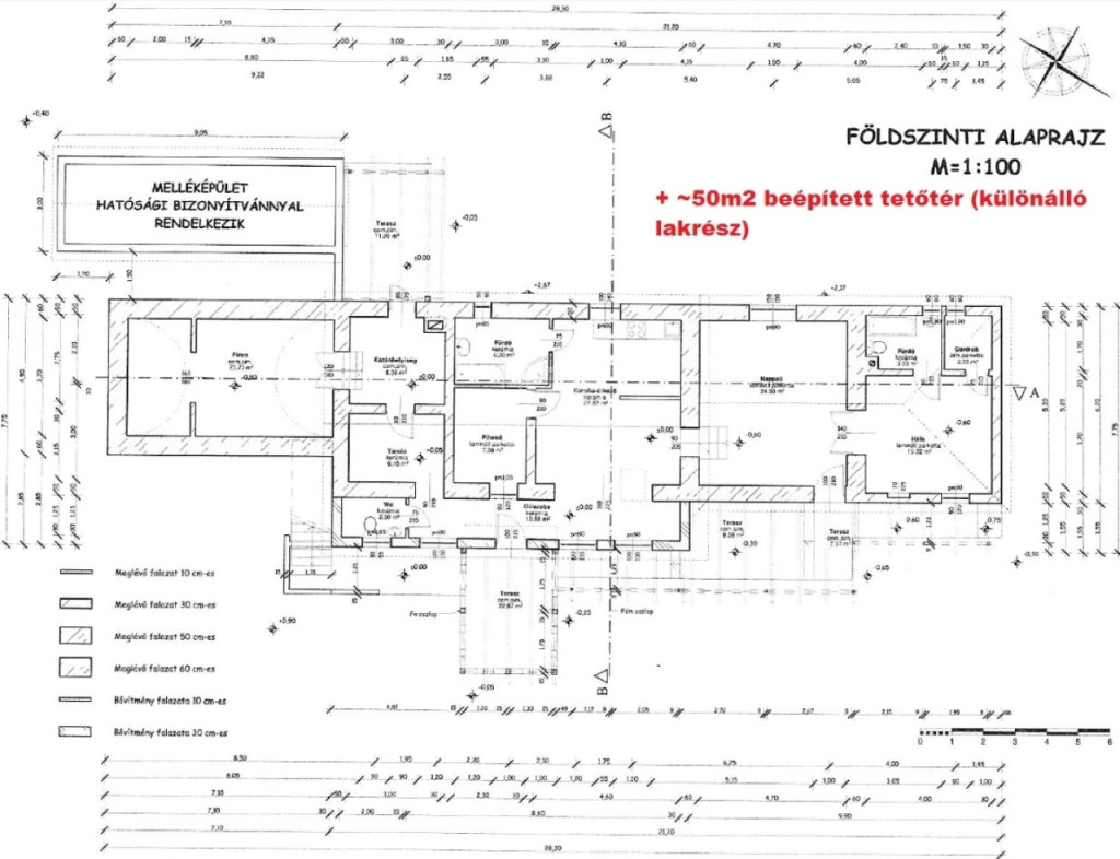 A földszinten (111m2) előszoba, közlekedő, konyha, vendég WC, 3 szoba, gardrób, két fürdőszoba, mosókonyha, kazánhelyiség (külön bejárattal) került kialakításra. A házhoz kapcsolódik egy ~30m2-es, boltíves pince is.