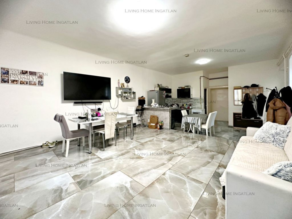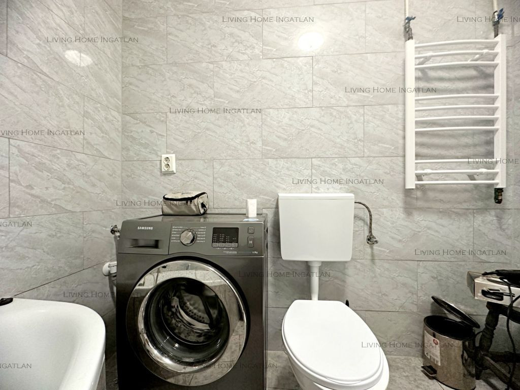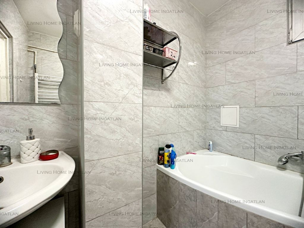 Layout: living room with American kitchen, bathroom with shower, bathroom with bathtub, toilet, 3 rooms, wardrobe.