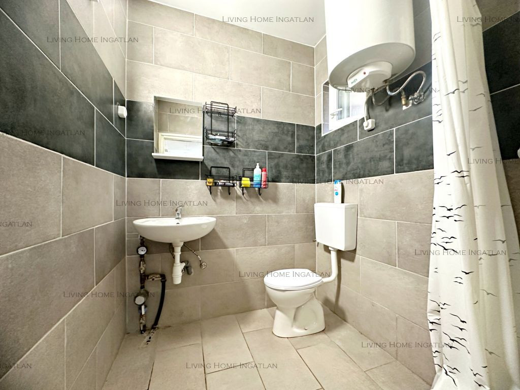 Beosztása: egy légterű nappali, étkező, konyha, háló, tusolós fürdő, wc.