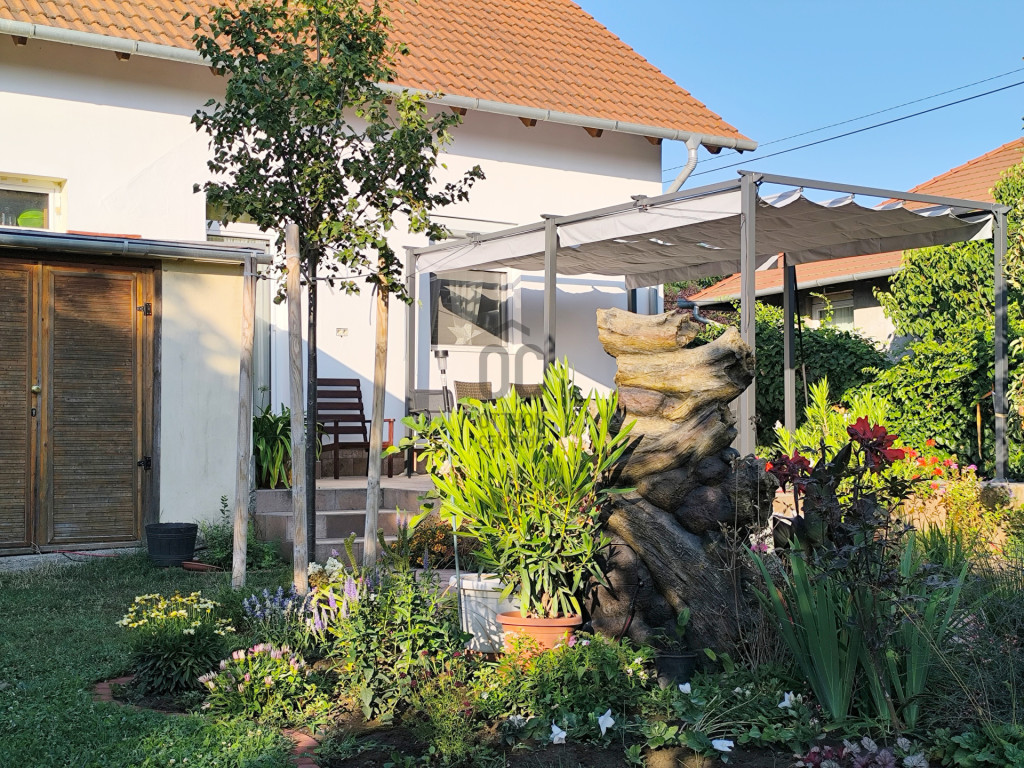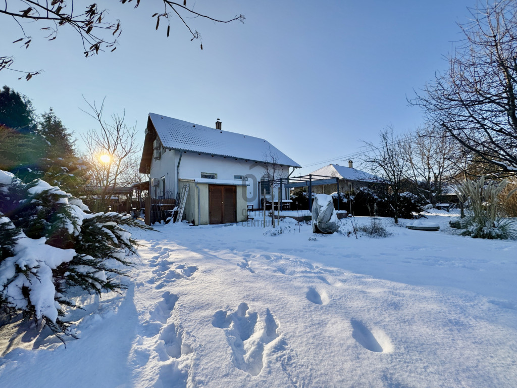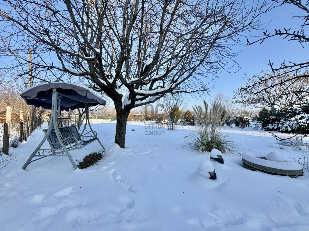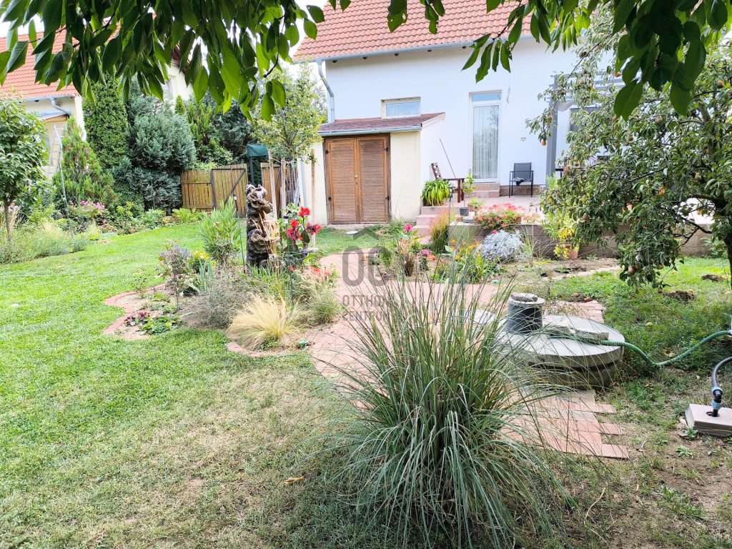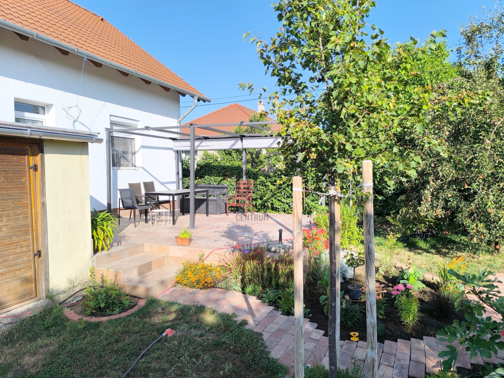 A sík, körbekerített kert biztonságos játszóteret kínál gyermekeknek, miközben gyümölcsfák, bogyós növények és szőlő teremtik meg a természetközeli életérzést. A fedett (13 m²) és a tágas, nyitott (35 m²) terasz ideális helyszín családi és baráti összejövetelekhez. Az udvaron 8 m²-es tároló, egy 3,5×7 méteres gépkocsibeálló, valamint további parkolási lehetőség áll rendelkezésre.