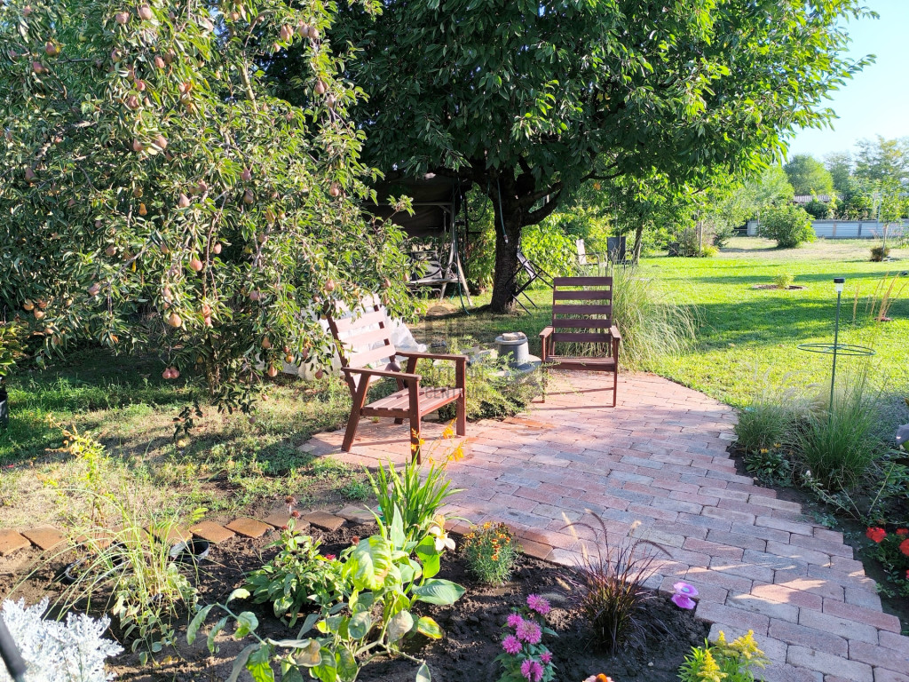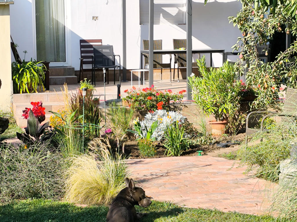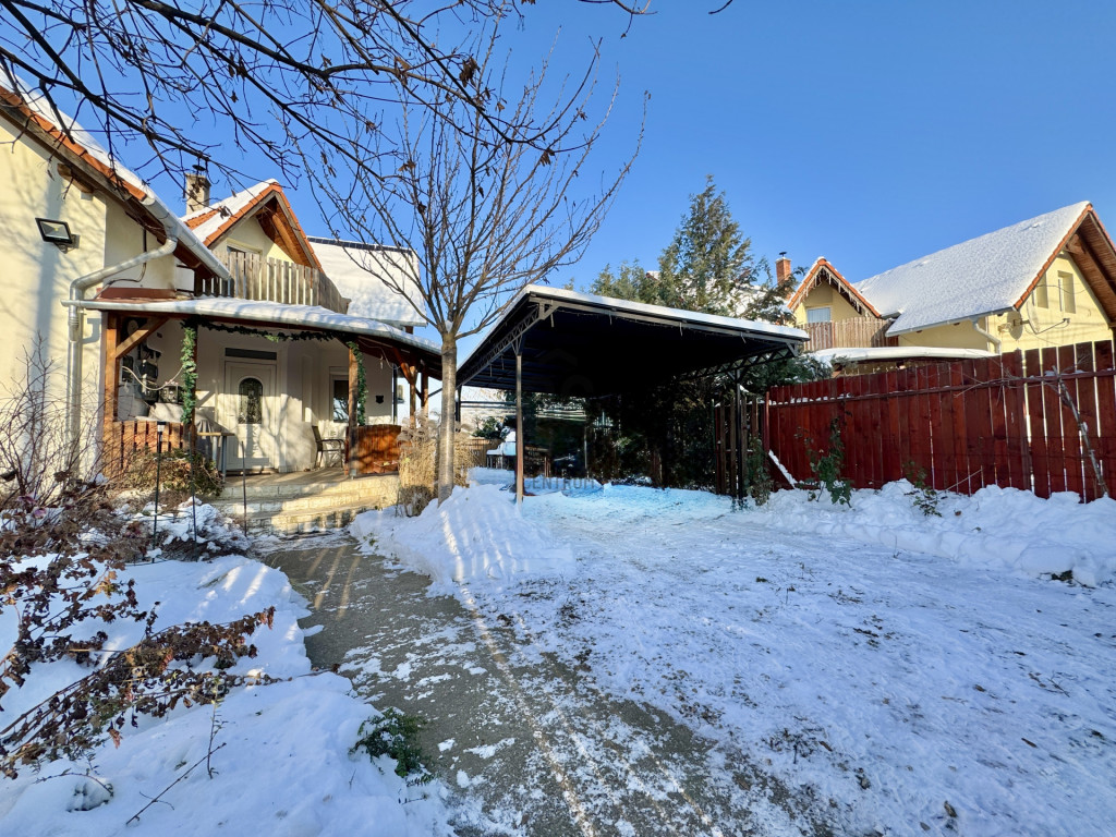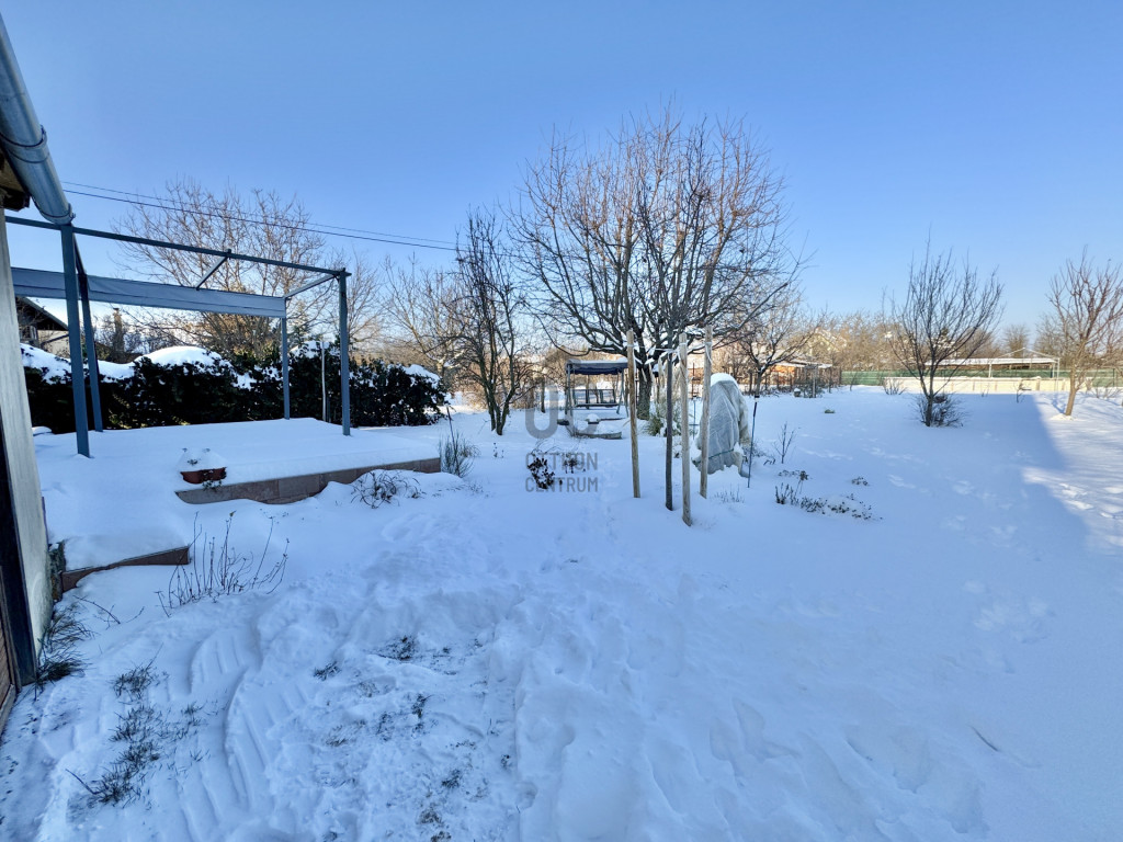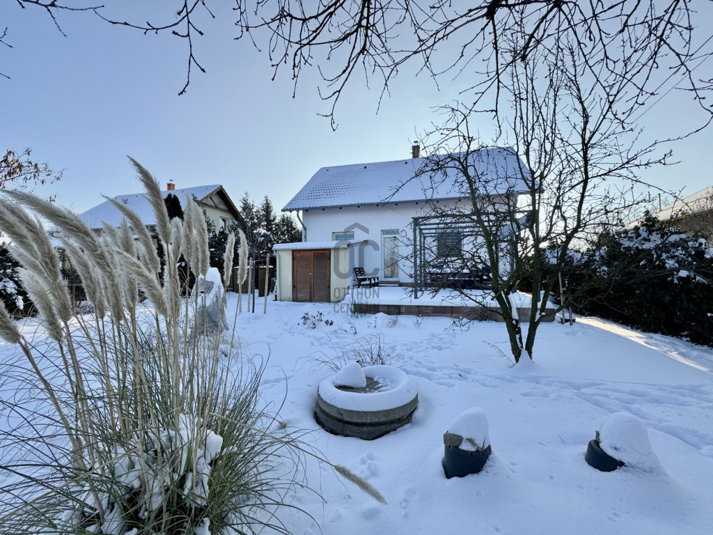 A sík, körbekerített kert biztonságos játszóteret kínál gyermekeknek, miközben gyümölcsfák, bogyós növények és szőlő teremtik meg a természetközeli életérzést. A fedett (13 m²) és a tágas, nyitott (35 m²) terasz ideális helyszín családi és baráti összejövetelekhez. Az udvaron 8 m²-es tároló, egy 3,5×7 méteres gépkocsibeálló, valamint további parkolási lehetőség áll rendelkezésre.
