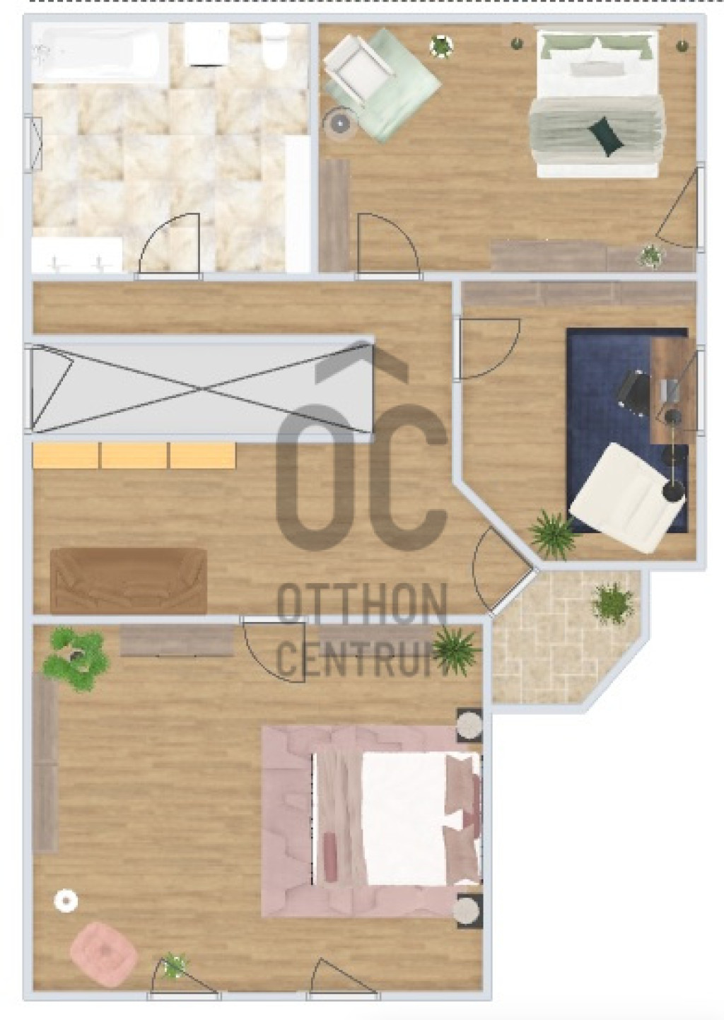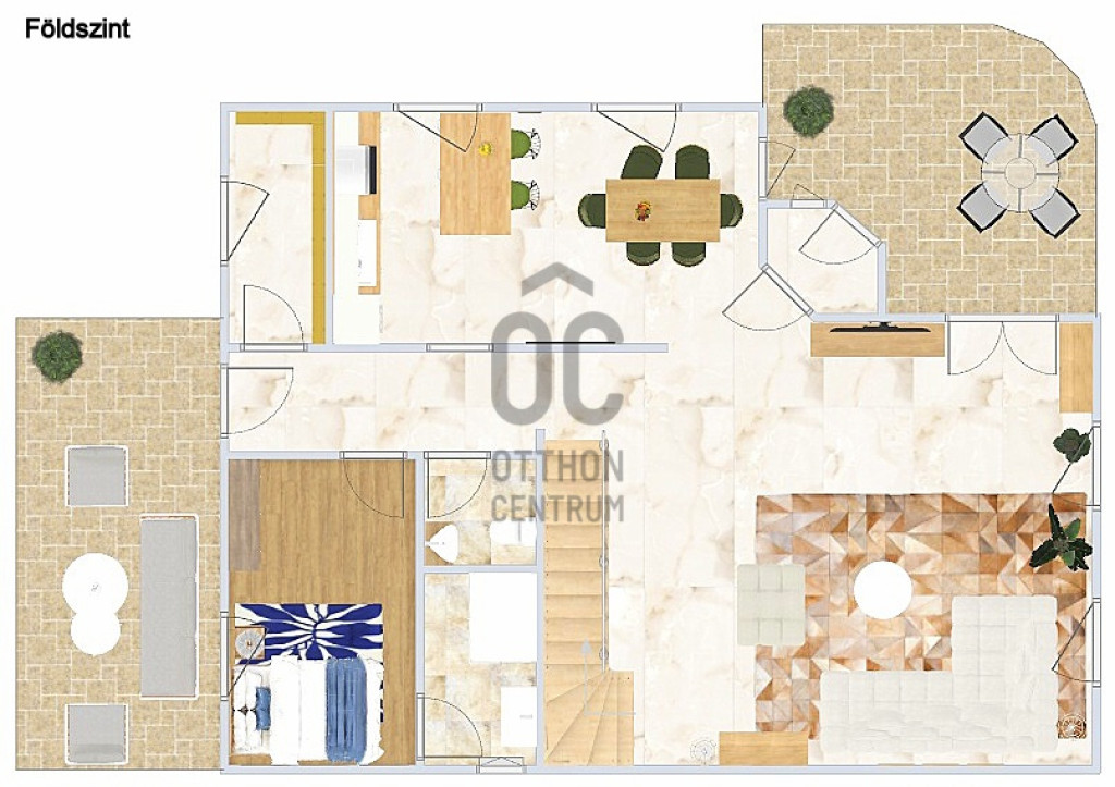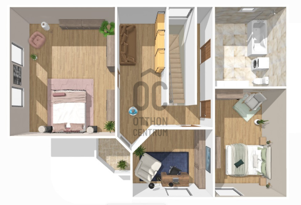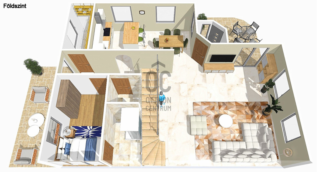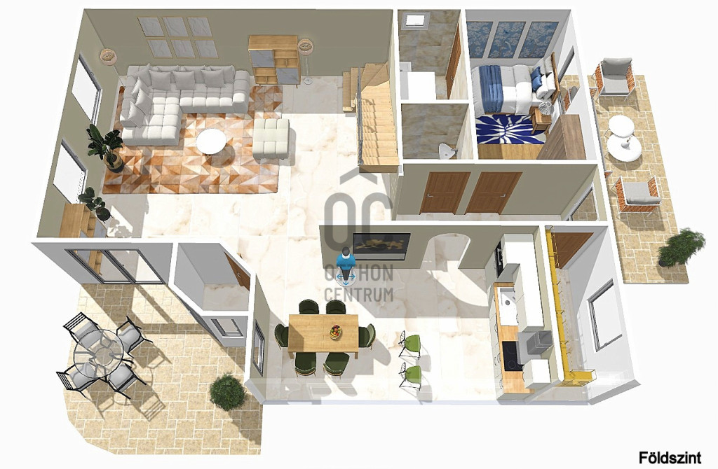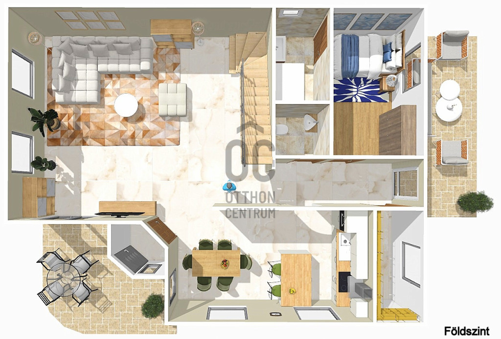 A földszinten egy tágas nappali–étkező–amerikai konyha alkotja a családi élet központját, továbbá egy külön hálószoba saját fürdőszobával, amely ideális lehet nagyszülőnek, vendégnek vagy otthoni irodának. Előszoba, kamra és külön WC egészíti ki a szintet. Az emeleten három jól bútorozható hálószoba, fürdőszoba és közlekedő található, míg az alagsor tárolóként és kazánházként funkcionál.