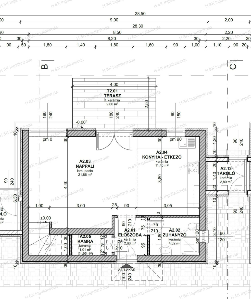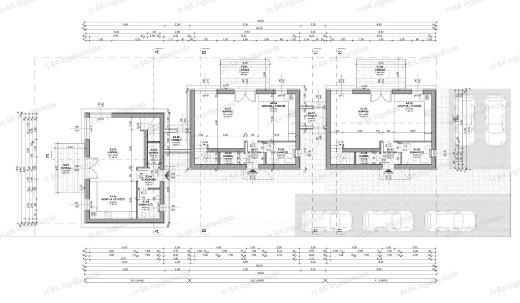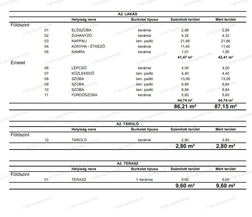 A lakások bruttó területe 92 nm, nettó lakóterület 87,15 nm + terasz + a 2-es lakásnál 2,8 nm külső tároló, belső kétszintes, nappali + három hálószobás, dupla-komfortos elrendezéssel.